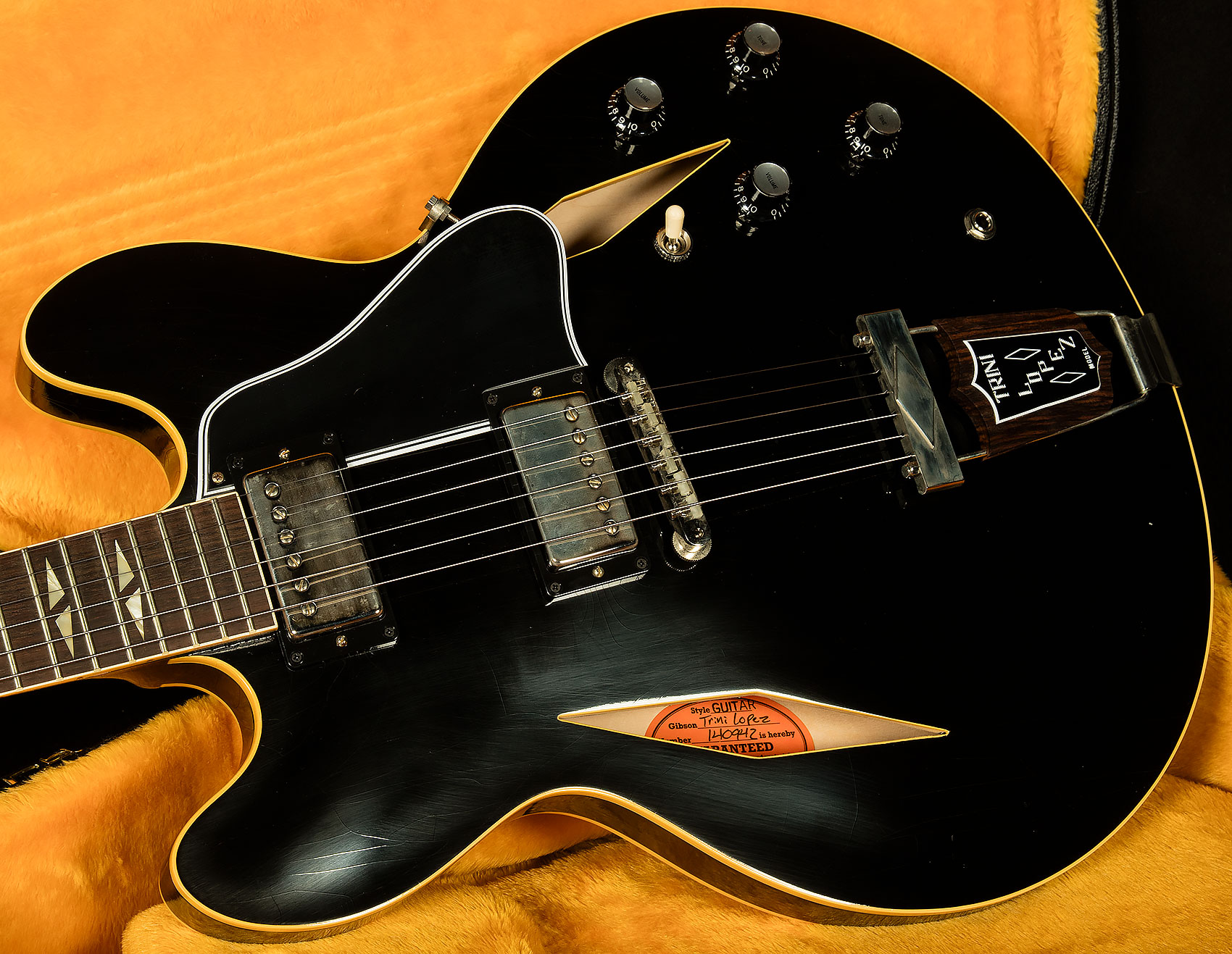 The 1964 Trini Lopez Standard Ultra Light Aged features an ES-style three-ply maple/poplar/maple semi-hollow thinline body with a solid maple centerblock for feedback resistance and enhanced sustain. The solid mahogany neck has a comfortable Medium C profile. It is equipped with a rosewood fretboard with 22 authentic medium jumbo frets and split diamond cellulose nitrate inlays that are one of the visual hallmarks of the Trini Lopez Standard. The diamond theme continues with the f-holes on the body, which are also diamond-shaped, as well as the single diamond trapeze tailpiece with Trini Lopez insert. The six-on-a-side headstock is often referred to as a Non-Reverse Firebird headstock. However, the design actually originated with the Trini Lopez Standard and predates the Non-Reverse Firebird, which wasn’t introduced until 1965.