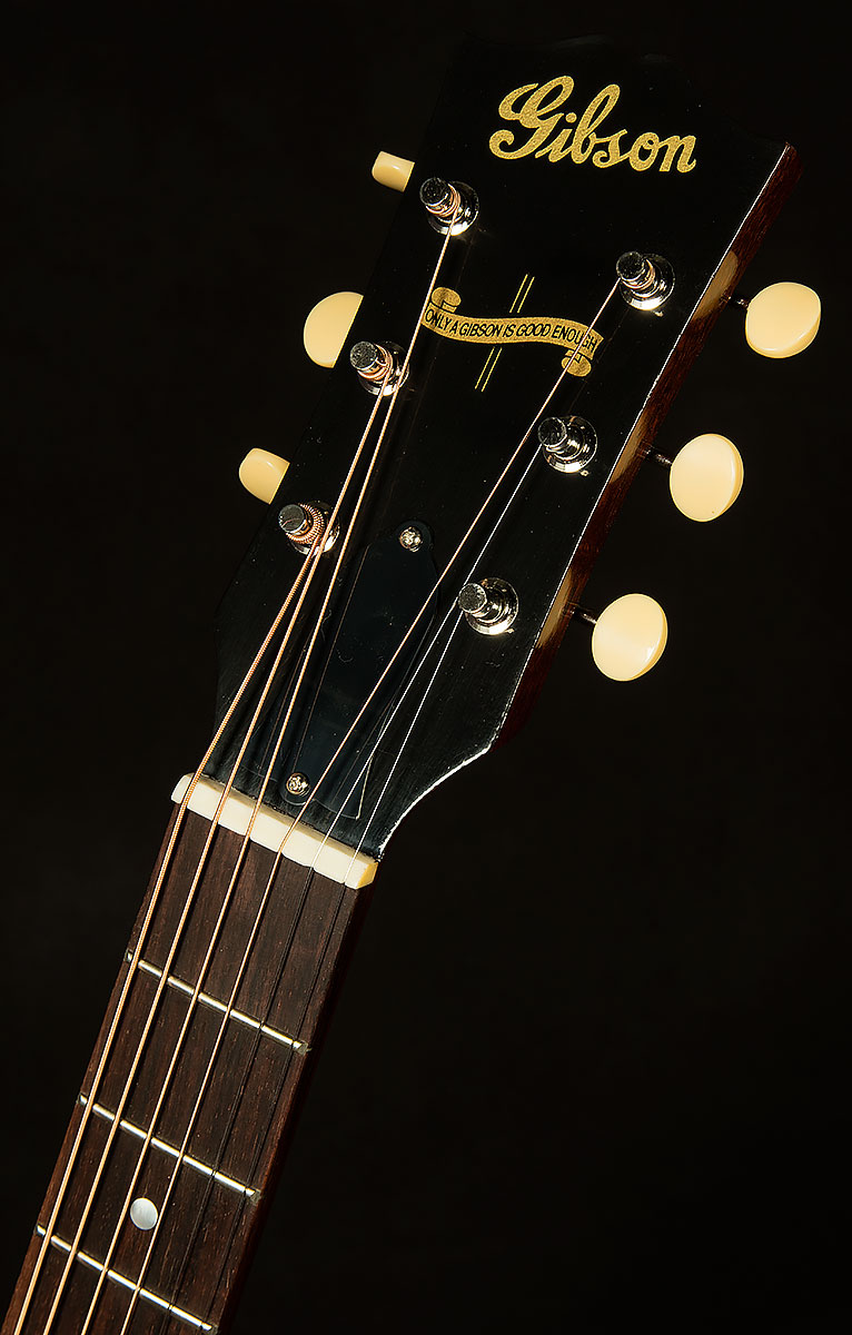 The top wood is the cornerstone of any acoustic guitar, and Gibson chose to use premium red Adirondack spruce for the 1942 Banner J-45, a move that we wholeheartedly applaud. Here at Wildwood, we love Adirondack spruce's tonal properties the way Kirk Hammett loves wah pedals: truly and deeply, with our entire collective heart. It just gives acoustic guitars a little more of everything: more percussive articulation in the attack, more projecting power, more volume, and more headroom. When paired with mahogany back and sides in these J-45s, it produces a warm, open, full tonality with plenty of midrange punch, and it responds equally well to subtle, nuanced fingerstyle playing and enthusiastic bluegrass strumming.