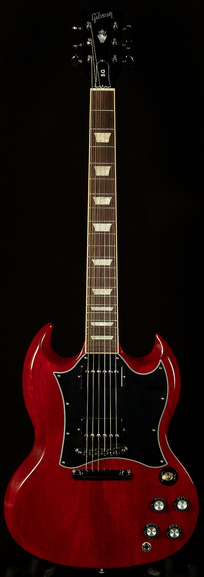 The Gibson SG Standard rocks the classic looks and features associated with the late '60s-style SG models sought after by many. A rounded profile mahogany neck, bound rosewood fingerboard, long tenon 19th fret neck joint, and a solid mahogany body provide the backbone for singing sustain. The 490R and 490T Alnico II pickups provide the power to drive. A black, 5-ply, full-face pickguard set this SG Standard apart from others... a truly versatile classic.