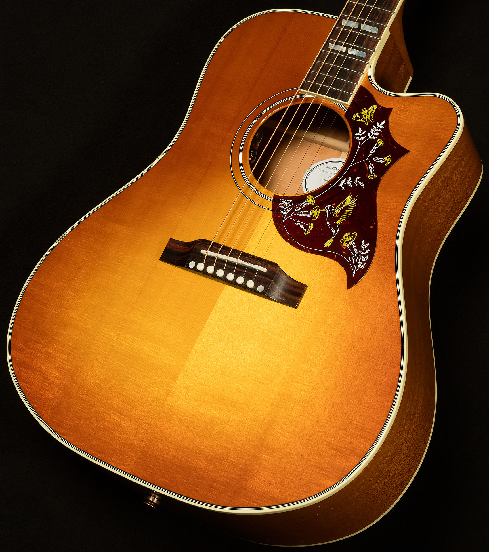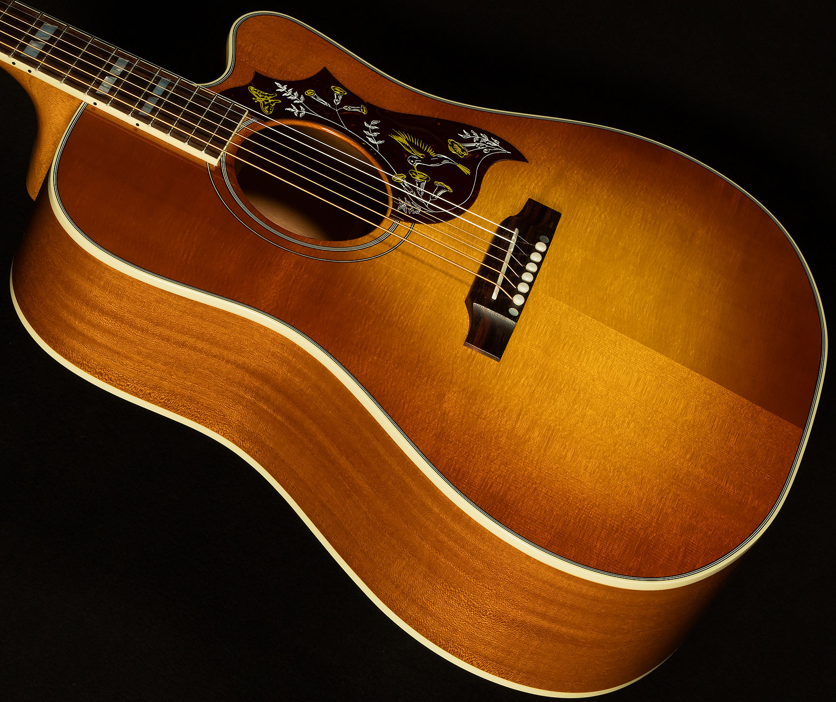 But, what really makes the Hummingbird Standard EC special is how responsive it is to player input. It has a wide dynamic range AND huge resonance, which is a rare and special combination. There are two reasons for its dynamism: its 24.75” scale length and its light build philosophy Acoustic guitars with shorter scales tend to have a warmer overall tonality, but they also boast a more percussive, articulate attack. The scale length works in harmonious tandem with the lighter build, which promotes fast response time and even frequency response at every volume level.