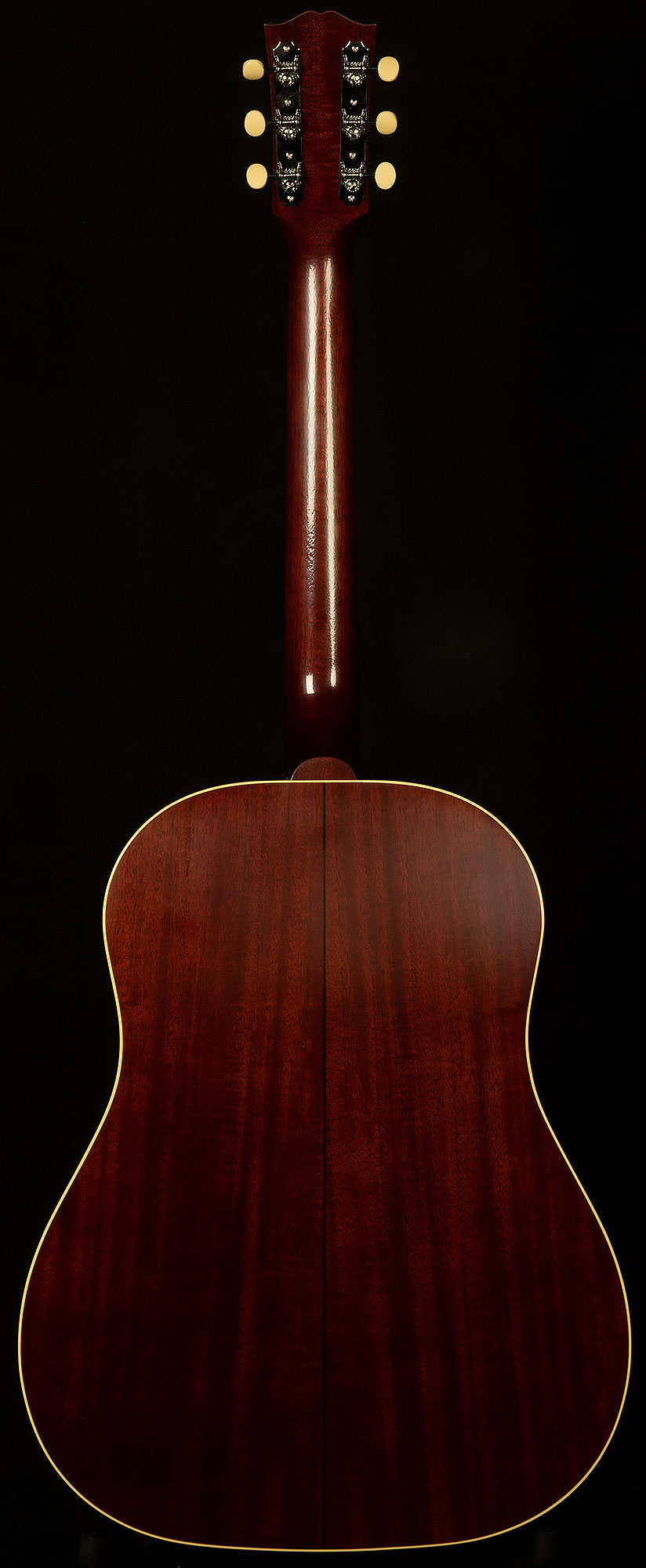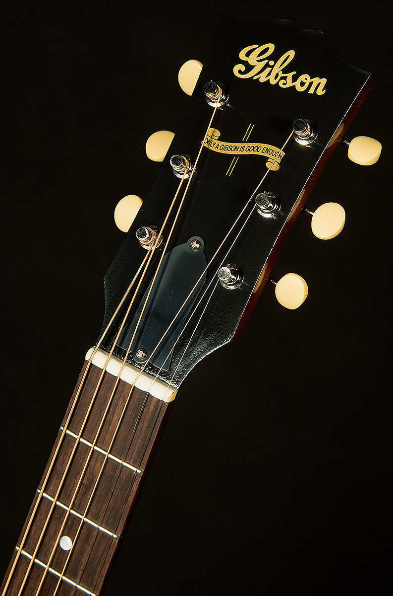The top wood is the cornerstone of any acoustic guitar, and Gibson chose to use premium red Adirondack spruce for the 1942 Banner J-45, a move that we wholeheartedly applaud. Here at Wildwood, we love Adirondack spruce's tonal properties the way Kirk Hammett loves wah pedals: truly and deeply, with our entire collective heart. It just gives acoustic guitars a little more of everything: more percussive articulation in the attack, more projecting power, more volume, and more headroom. When paired with mahogany back and sides in these J-45s, it produces a warm, open, full tonality with plenty of midrange punch, and it responds equally well to subtle, nuanced fingerstyle playing and enthusiastic bluegrass strumming.