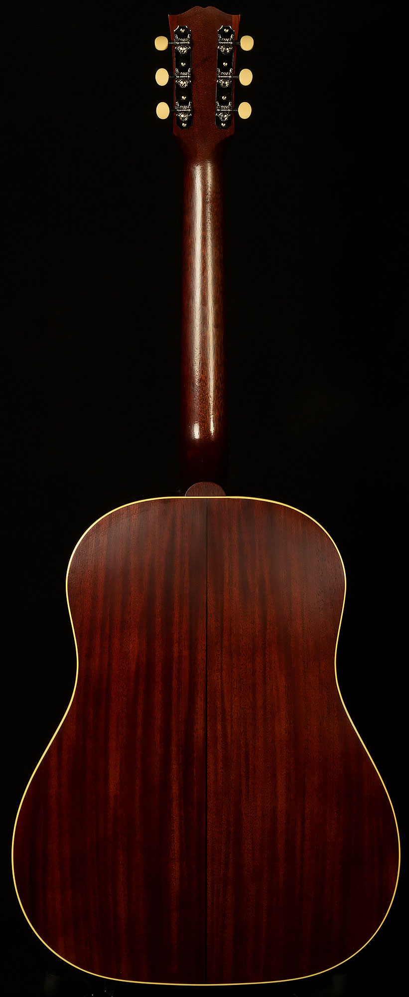 The top wood is the cornerstone of any acoustic guitar, and Gibson chose to use premium red Adirondack spruce for the 1942 Banner J-45, a move that we wholeheartedly applaud. Here at Wildwood, we love Adirondack spruce's tonal properties the way Kirk Hammett loves wah pedals: truly and deeply, with our entire collective heart. It just gives acoustic guitars a little more of everything: more percussive articulation in the attack, more projecting power, more volume, and more headroom. When paired with mahogany back and sides in these J-45s, it produces a warm, open, full tonality with plenty of midrange punch, and it responds equally well to subtle, nuanced fingerstyle playing and enthusiastic bluegrass strumming.