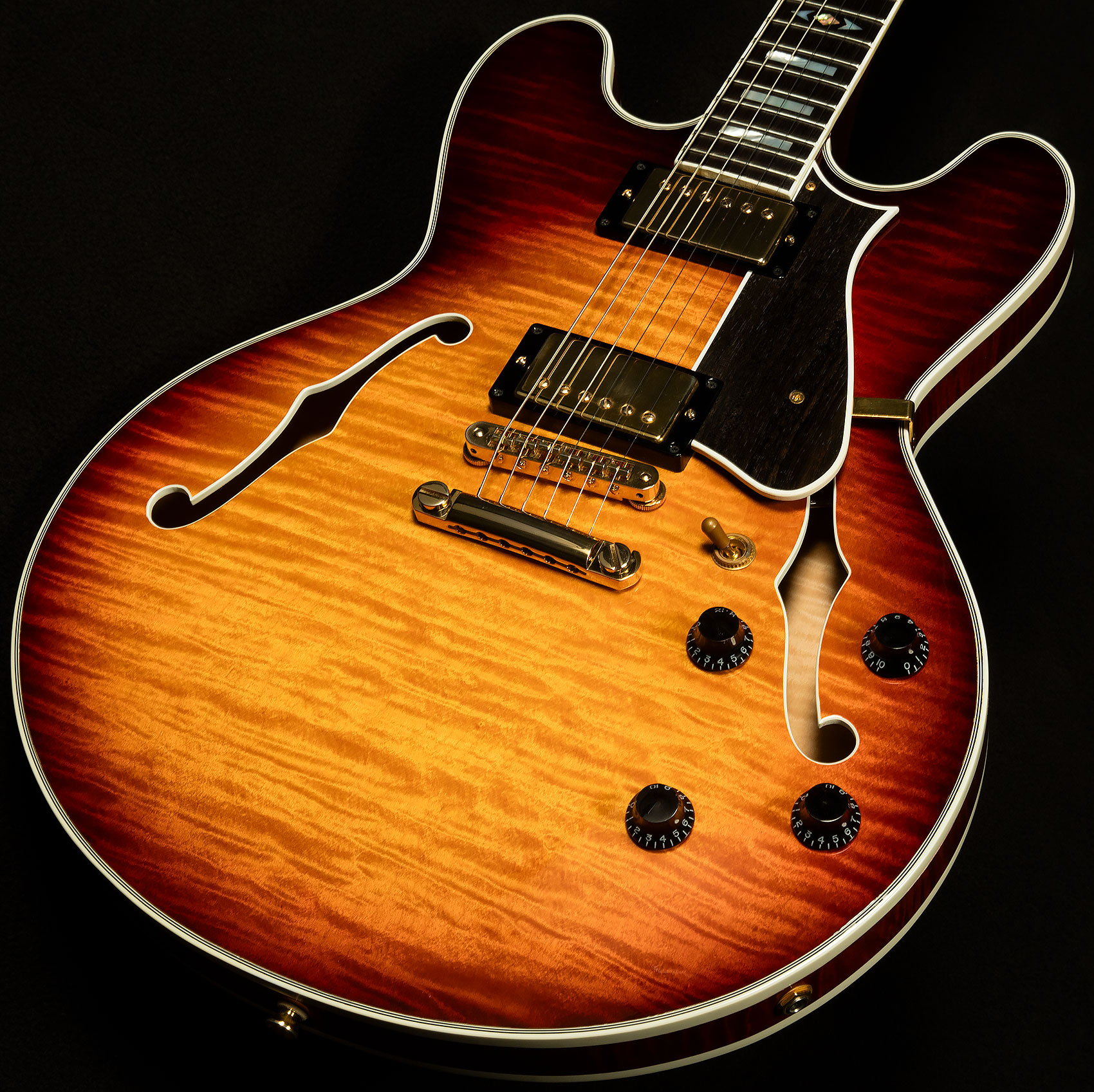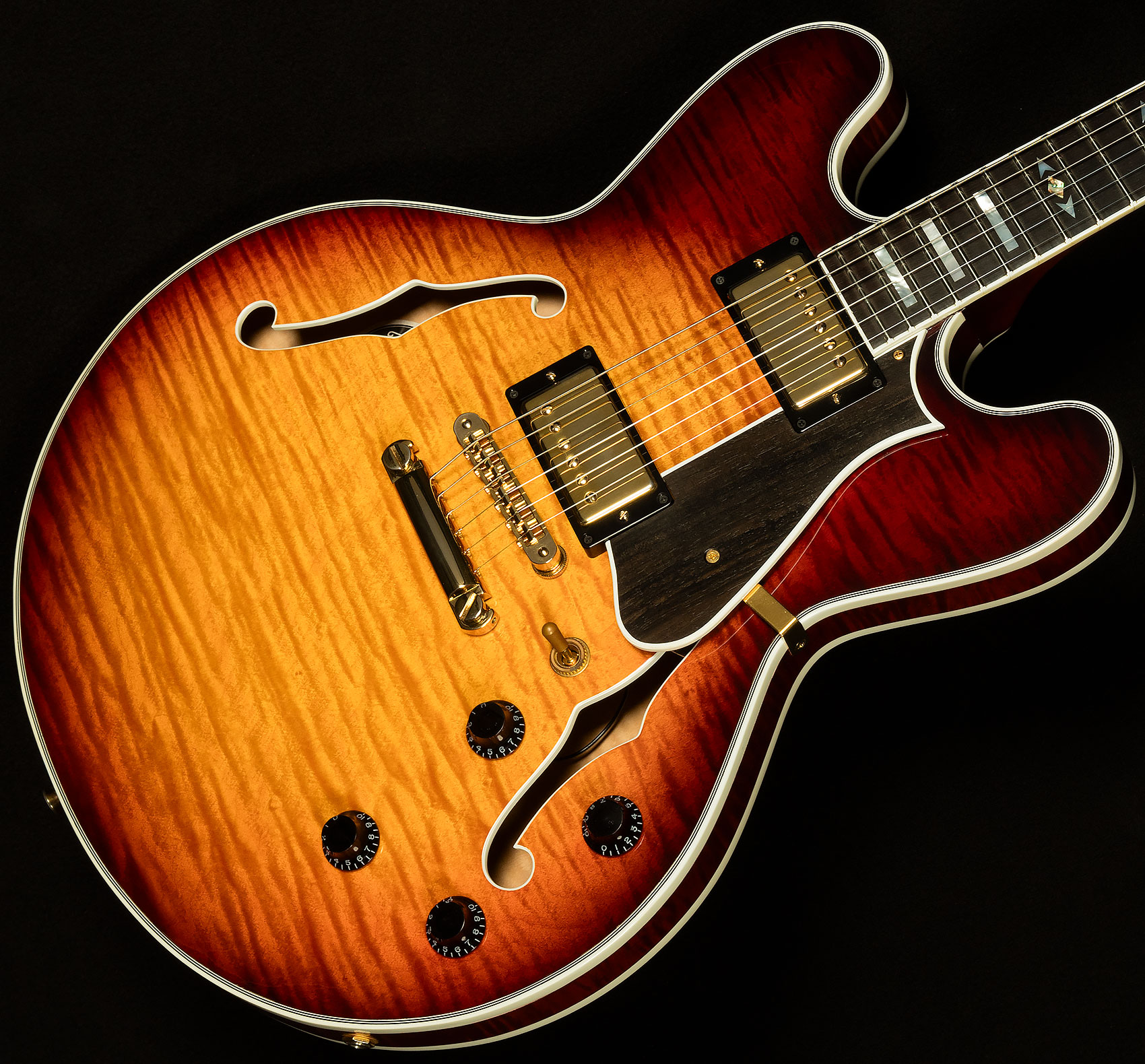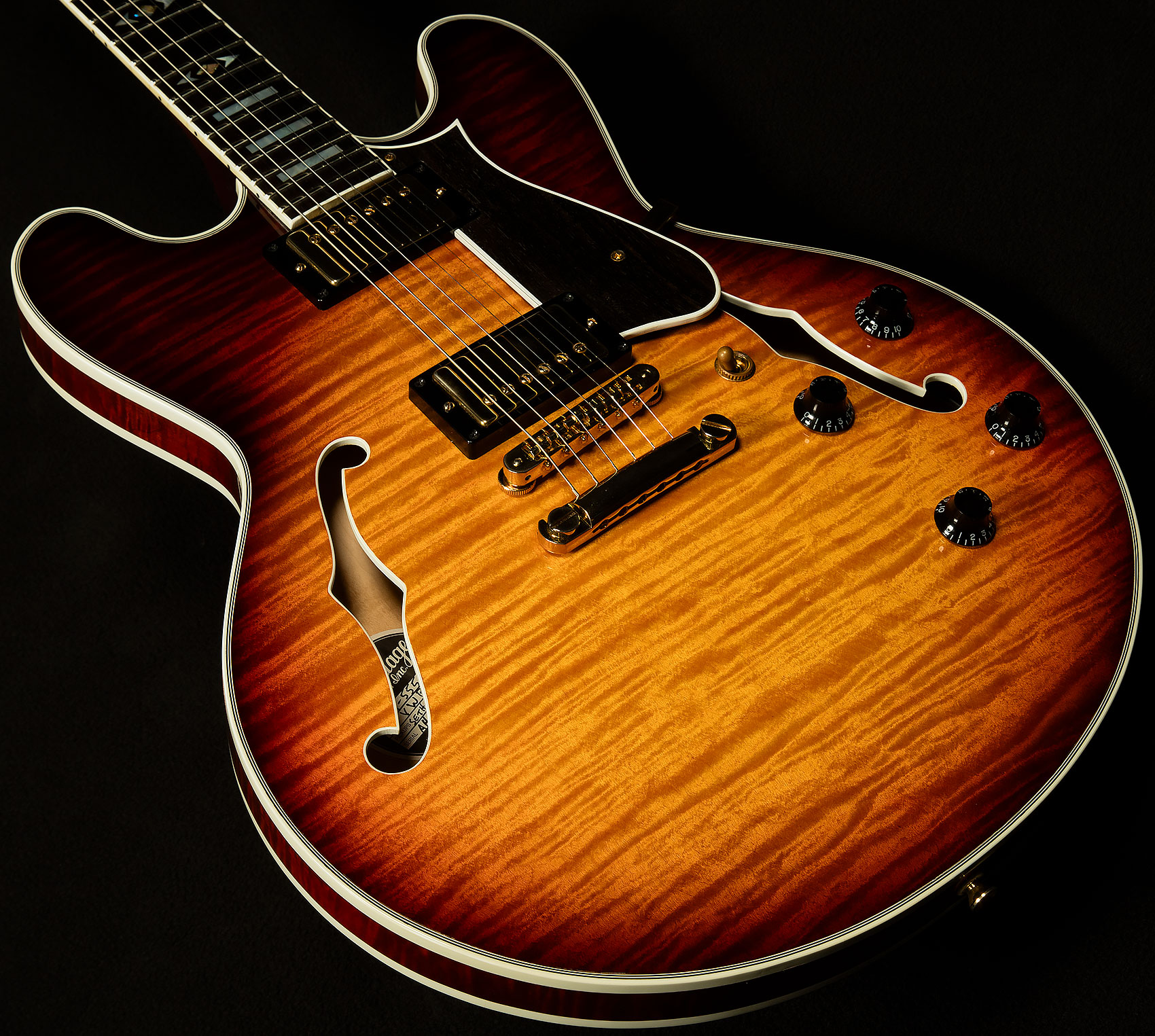 The attack is woody and percussive, and overall this serial has an acoustic-like touch-sensitivity. The neck pickup is sweet, warm, and creamy, with a complex midrange, deep lows and glassy highs. The bridge pickup snarls and crunches beautifully, with punchy midrange, tight lows and gorgeous open, sparkly highs.