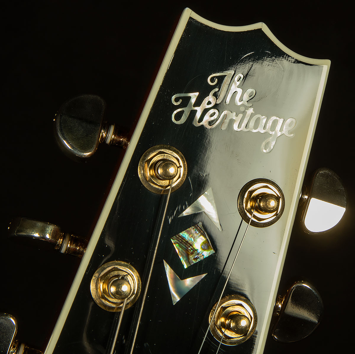 This gorgeous heritage H-555 is in fantastic shape! The frets look perfect, and it has just a few small cosmetic imperfections. There are some faint scratches and tiny dings in the finish on the body, and the hardware has tarnished a little, with some areas were the gold plating has worn off. There are also a few small marks and dings on the headstock face, and a slight impression left by a clip-on tuner. Finally, there's some light checkin in areas of the body binding, heel cap, headstock inlay, and (most noticeably) on the fretboard binding at the fret ends. All in all, it's quite clean, and it comes with its original hardshell case!