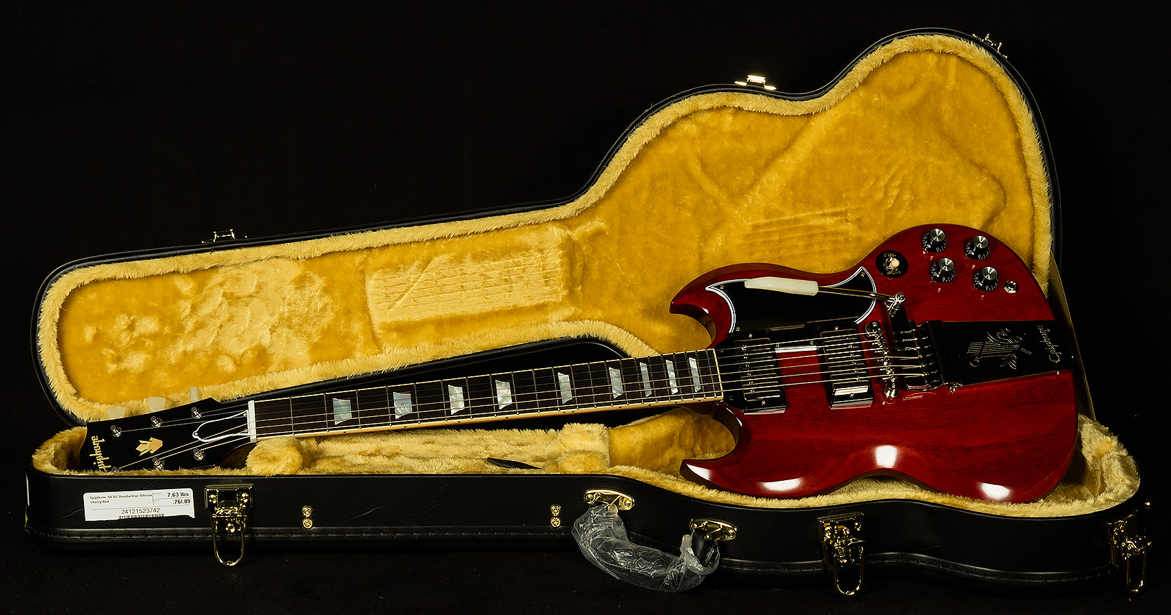 The 1964 SG Standard Reissue With Maestro Vibrola recreates one of the most beloved SG model years of all time–the 1964 SG Standard. While the 1964 SG Standard was famously used by such notable players as George Harrison and Eric Clapton, the model year was a standout for the SG in general. By 1964, the less intuitive Sideways Vibrato had been replaced with the dependable Maestro Vibrola, while the neck profile increased in size somewhat from the ultra-thin neck profiles found on some of the earlier SG models, and the SG’s balance, playability, and look seemed to come into its own. 1964 was also the first full year that the SG dispensed with the Les Paul moniker it previously used. Now, Epiphone is proud to release the 1964 SG Standard Reissue With Maestro Vibrola, a stunning recreation of that legendary model. Made in collaboration with Gibson Custom, the Epiphone 1964 SG Standard Reissue With Maestro Vibrola is the most authentic recreation of the 1964 SG Standard ever released by Epiphone. All of the classic appointments the 1964 SG Standard model is known and loved for are present here, including a one-piece mahogany neck with a long neck tenon for increased stability and sustain, a comfortable, fast-playing SlimTaper profile, and a bound rosewood fretboard. It also features mother-of-pearl trapezoid fretboard inlays, an aged mother-of-pearl Epiphone headstock logo, and an aged mother-of-pearl Gibson crown headstock inlay on the Gibson-style “open book” headstock. The center-seamed, two-piece mahogany body features the comfortable and distinctive bevels that help define a vintage-style SG and make it so comfortable to hold and play. The electronics are equally impressive, with two USA Gibson Custombucker humbucking pickups with Alnico 3 magnets that are hand-wired to CTS potentiometers, Black Beauty paper-in-oil capacitors, and a Switchcraft pickup selector toggle switch and output jack. The Vintage Gloss finish is nicely complimented by the nickel hardware, including Epiphone Vintage Deluxe “Double Ring” tuners. A black hardshell case with Inspired by Gibson Custom graphics, gold hardware, and a goldenrod interior is also included.