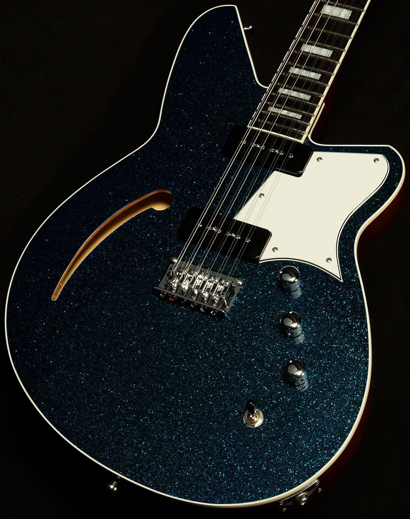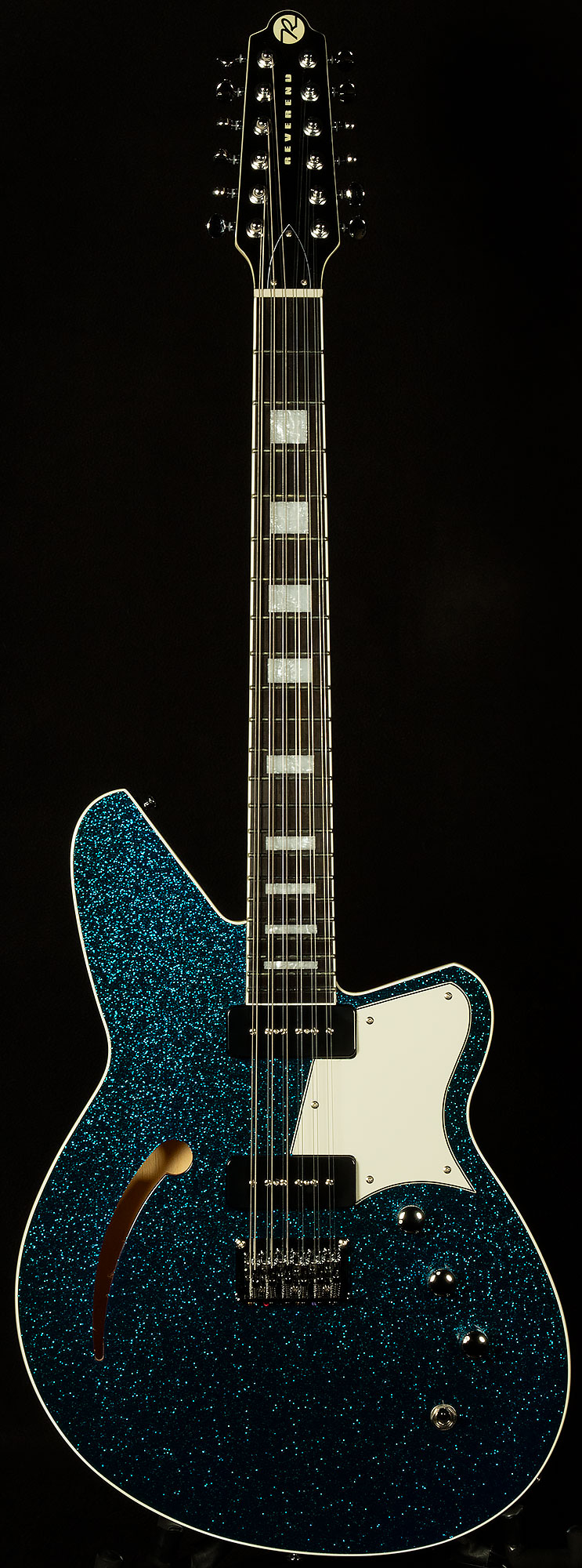 The most important of these appointments is the twelve-saddle bridge. Having the ability to tweak each string allows for precise intonation, which means that each every chord you play will be more in tune. That level of accuracy ensures that this twelve-string will always chime like a clocktower bell! Speaking of tuning, the Boneite nut and Reverend’s pin-lock tuners give this guitar fantastic tuning stability, so you won’t have to spend forever tuning in between songs.
