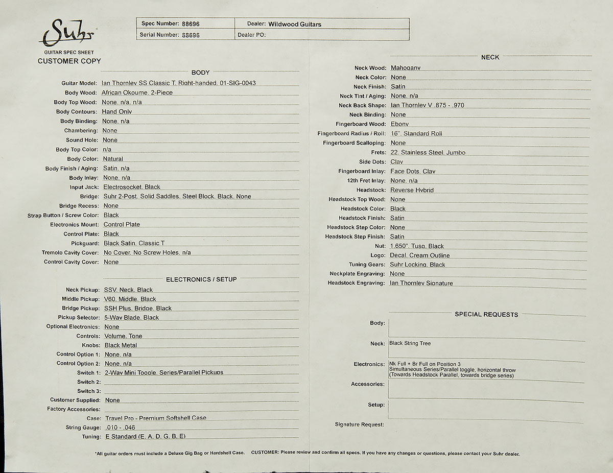 Ian Thornley has dubbed his newest signature model, The Lumberjack. This guitar is an evolution of Ian’s vision and something completely new for 2022. ‘The Lumberjack’ is a Suhr Classic T with a very unique wood combination, mixed with Ian’s signature wiring configuration and Ian’s signature neck shape.
