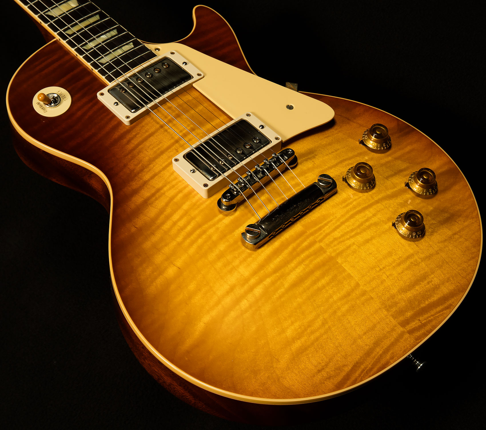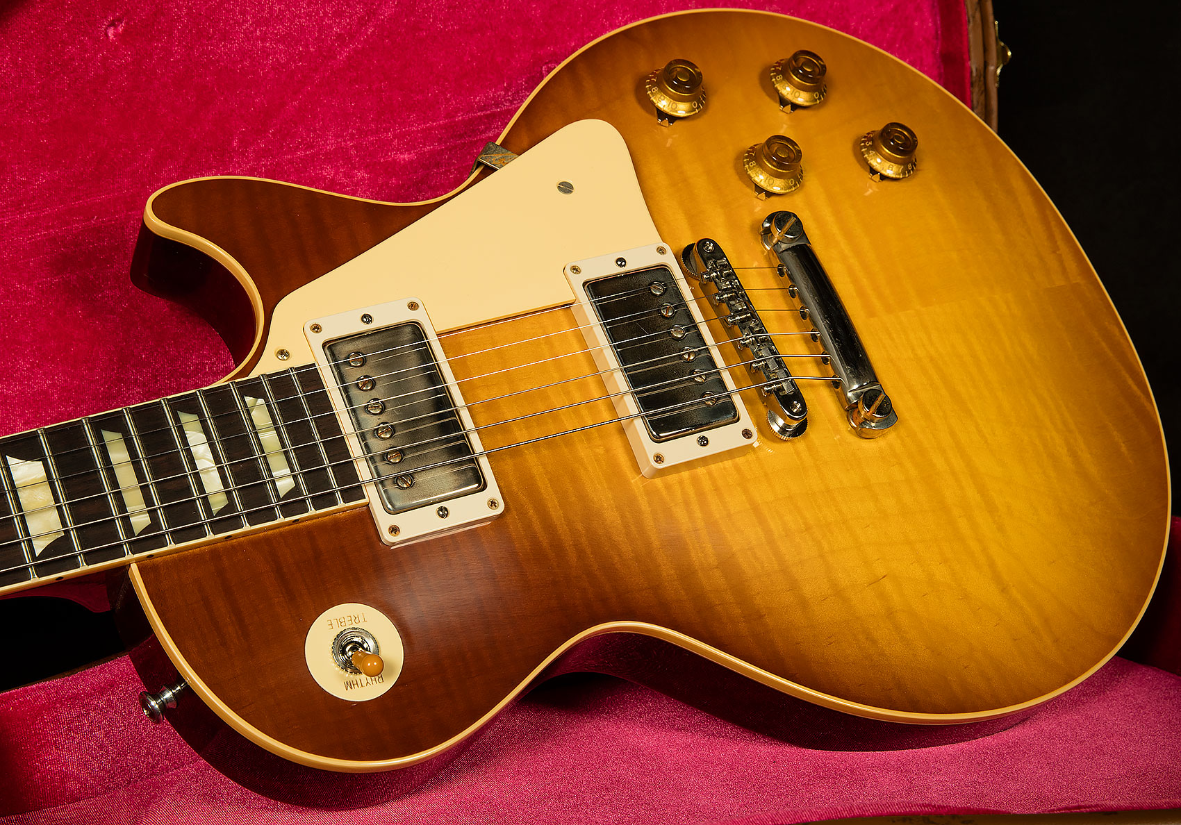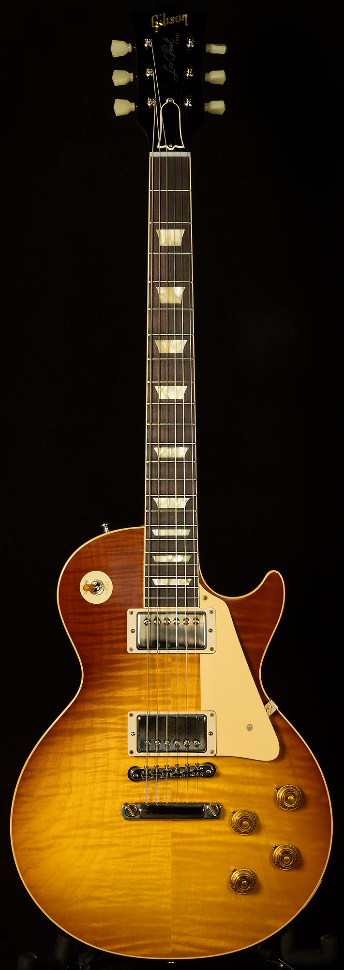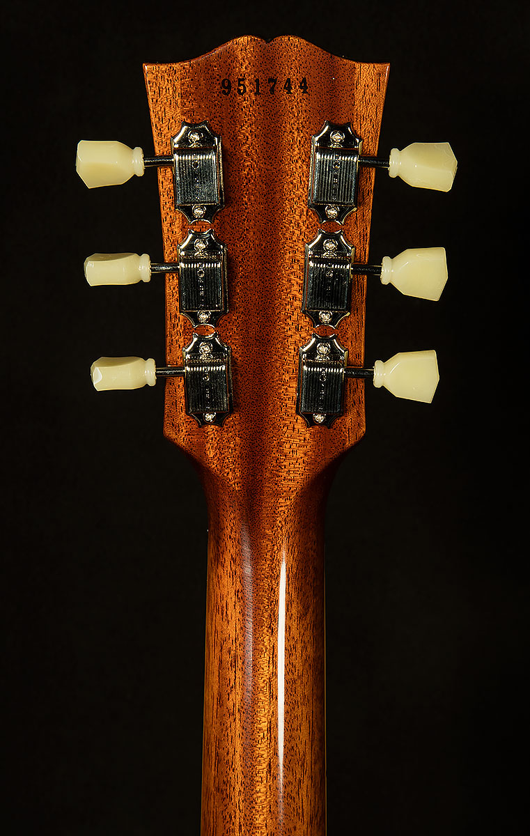 In our never-ending quest for total vintage accuracy, we asked the Custom Shop to put aged plastics on our VOS Wildwood Spec '59s. They obliged, and the resulting hardware looked perfect. It may seem like a small detail, but it really does make you feel like Gibson pulled these guitars from a time capsule.