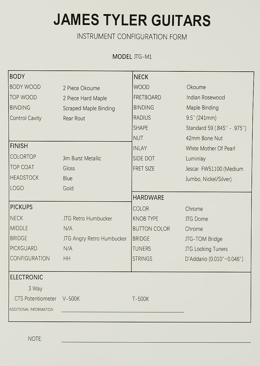 | Pickups | 1 JTG Retro Humbucker (Neck), 1 JTG Super Humbucker (Bridge) |