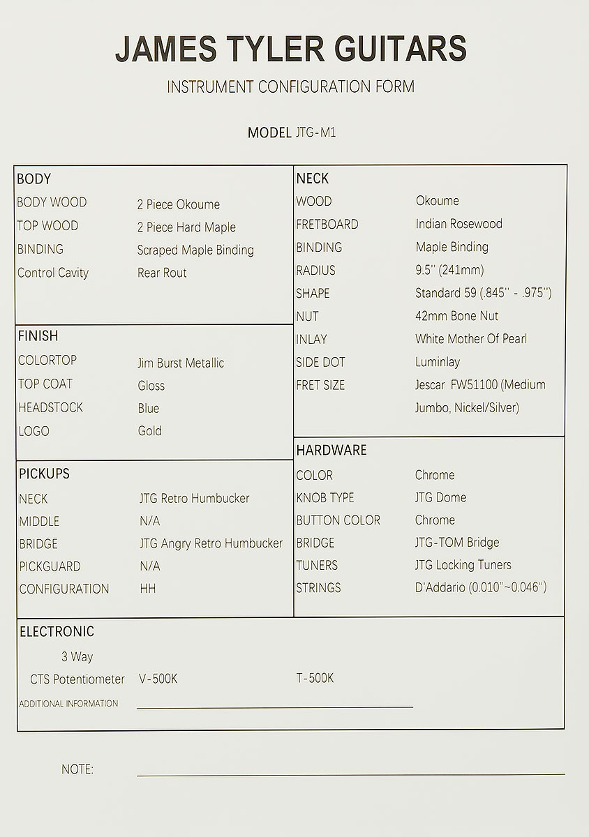 | Pickups | 1 JTG Retro Humbucker (Neck), 1 JTG Super Humbucker (Bridge) |