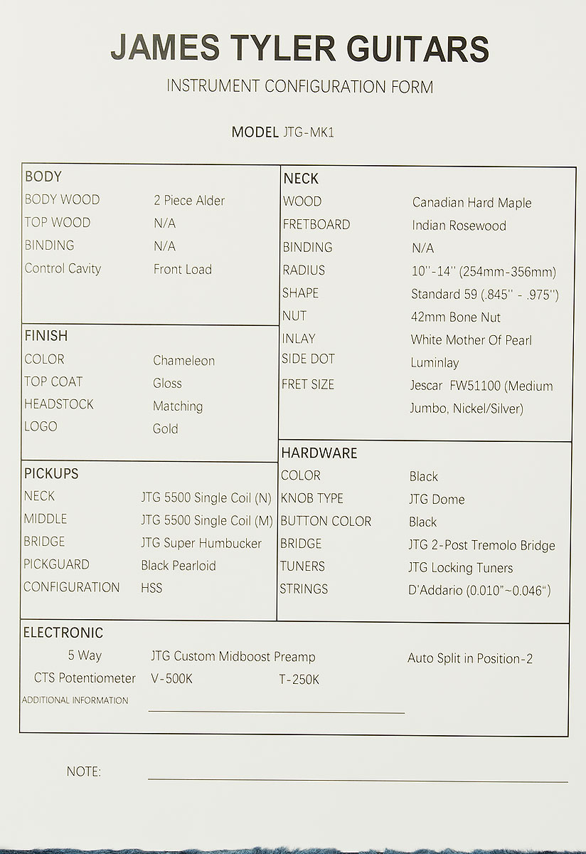 | Controls | 1 500K CTS Volume Pot, 1 250K CTS Tone Pot, 5-way Selector Switch, JTG Custom Midboost Control with Bypass Button |