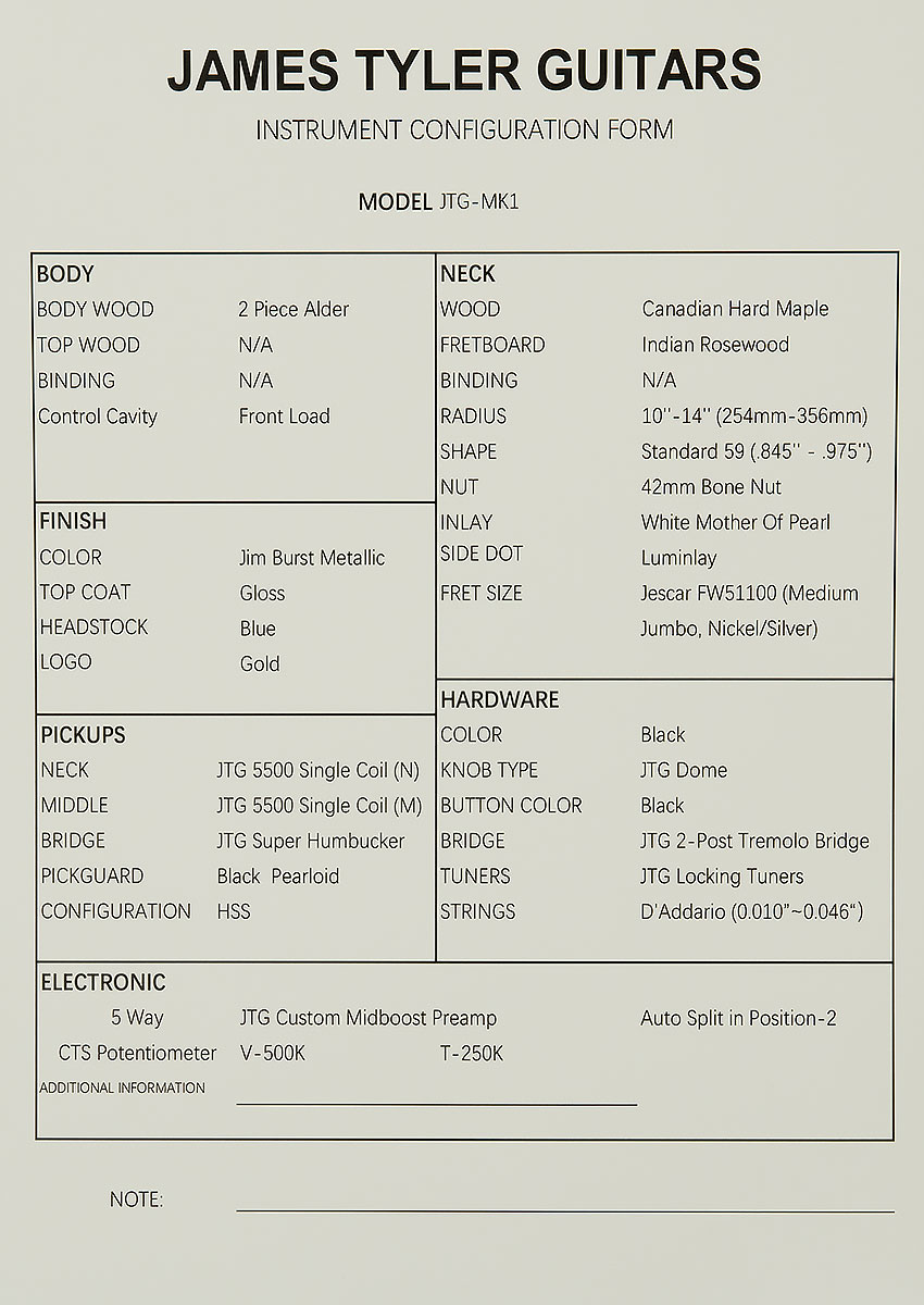 | Controls | 1 500K CTS Volume Pot, 1 250K CTS Tone Pot, 5-way Selector Switch, JTG Custom Midboost Control with Bypass Button |