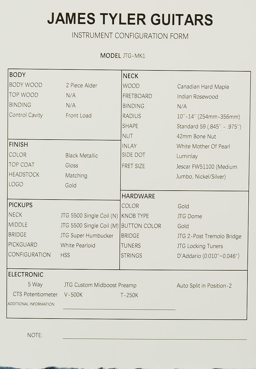 Controls1 500K CTS Volume Pot, 1 250K CTS Tone Pot, 5-way Selector Switch, JTG Custom Midboost Control with Bypass Button