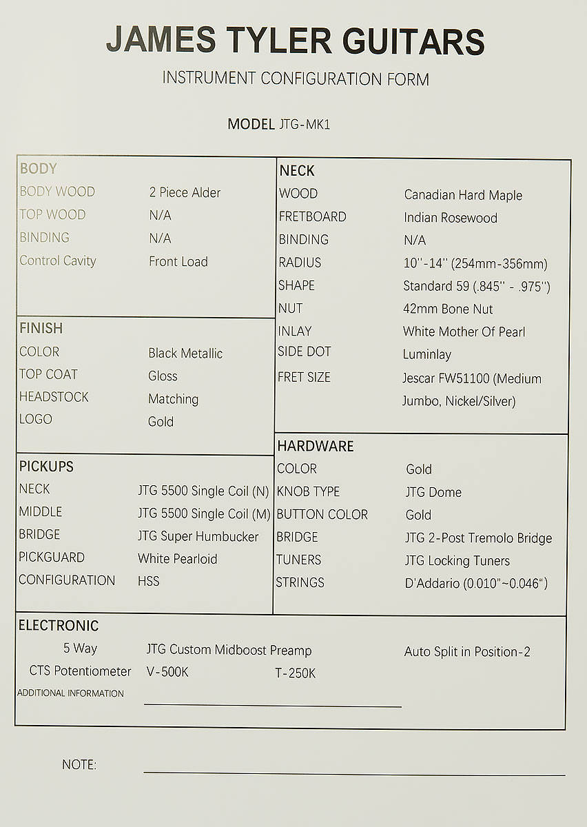 | Controls | 1 500K CTS Volume Pot, 1 250K CTS Tone Pot, 5-way Selector Switch, JTG Custom Midboost Control with Bypass Button |