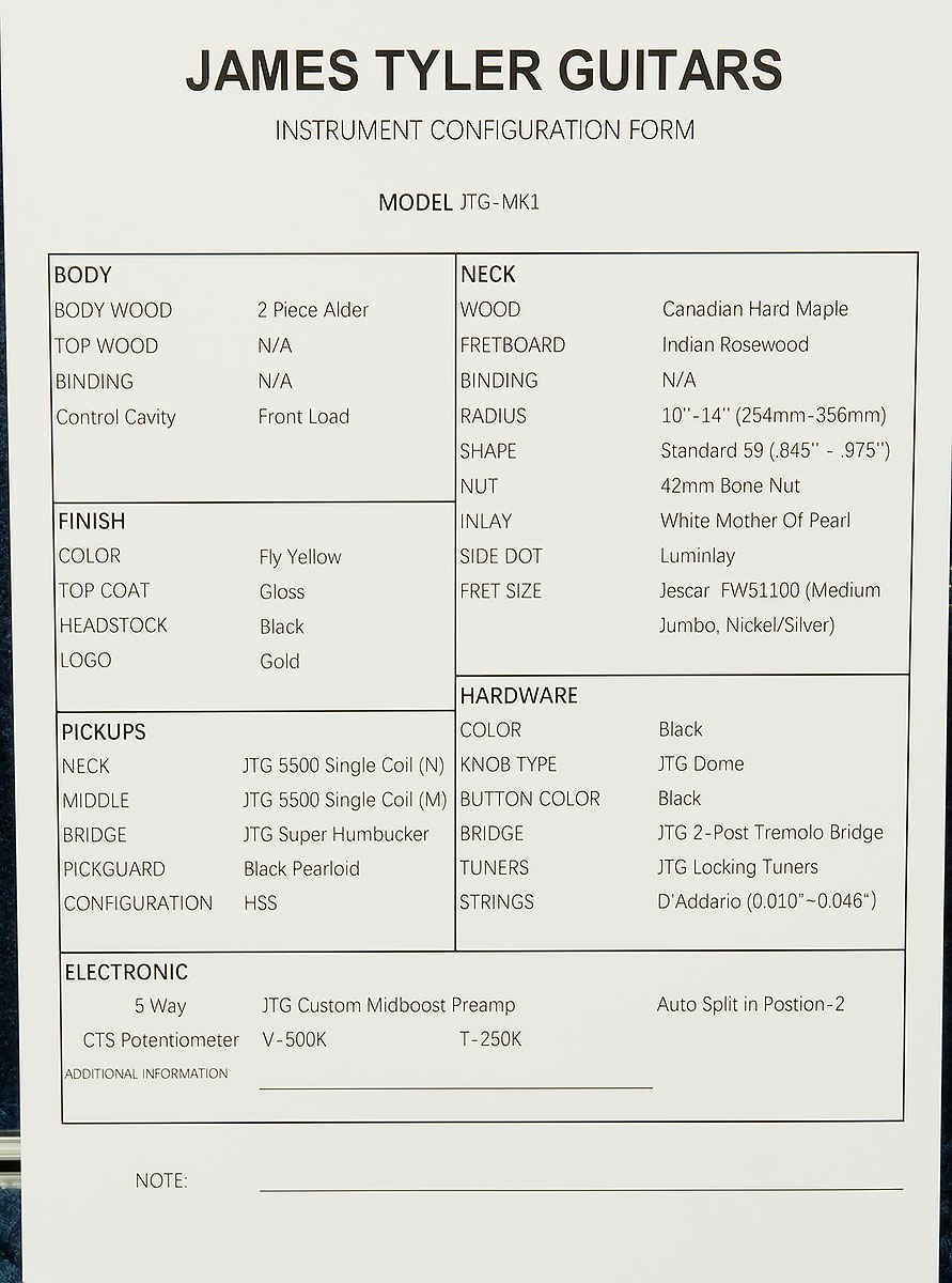 | Controls | 1 500K CTS Volume Pot, 1 250K CTS Tone Pot, 5-way Selector Switch, JTG Custom Midboost Control with Bypass Button |