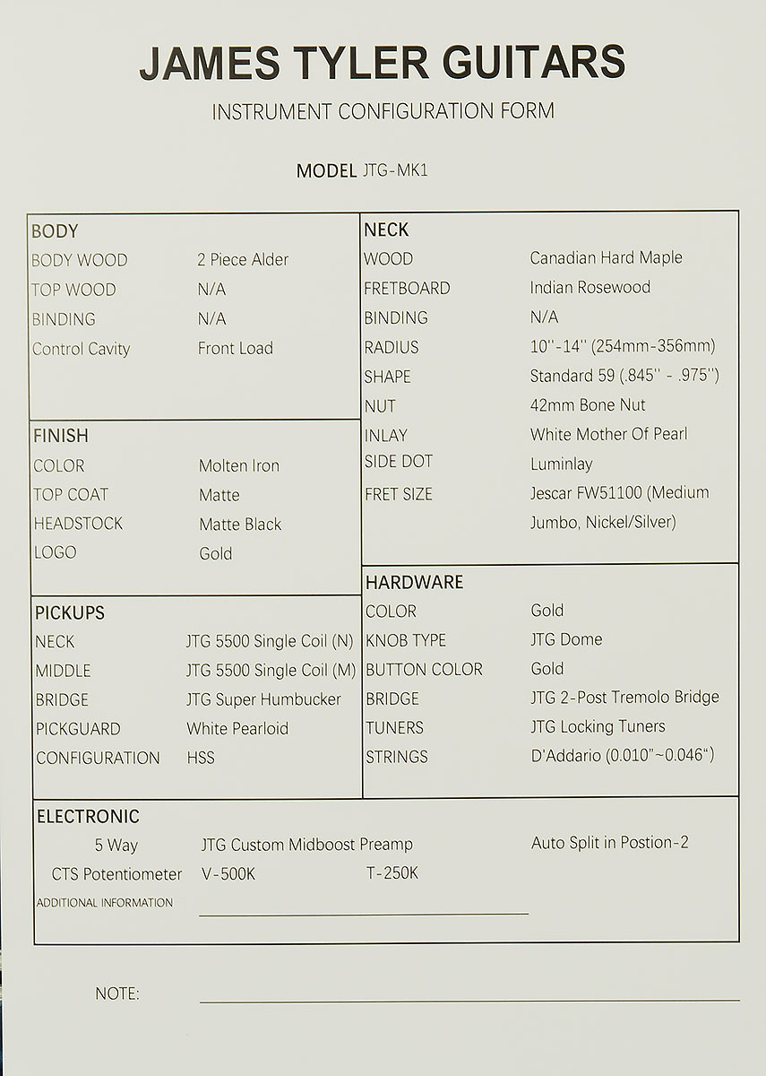 | Controls | 1 500K CTS Volume Pot, 1 250K CTS Tone Pot, 5-way Selector Switch, JTG Custom Midboost Control with Bypass Button |