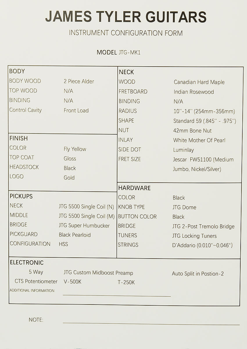 | Controls | 1 500K CTS Volume Pot, 1 250K CTS Tone Pot, 5-way Selector Switch, JTG Custom Midboost Control with Bypass Button |