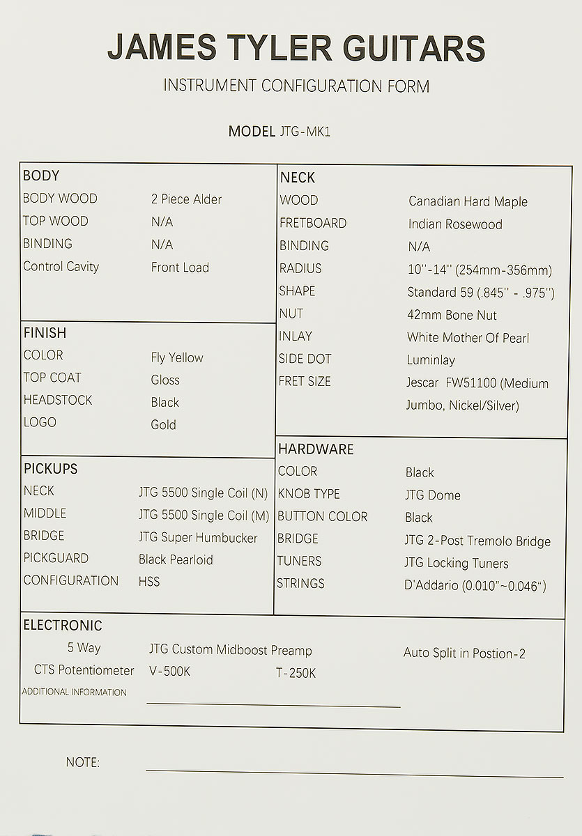 | Controls | 1 500K CTS Volume Pot, 1 250K CTS Tone Pot, 5-way Selector Switch, JTG Custom Midboost Control with Bypass Button |