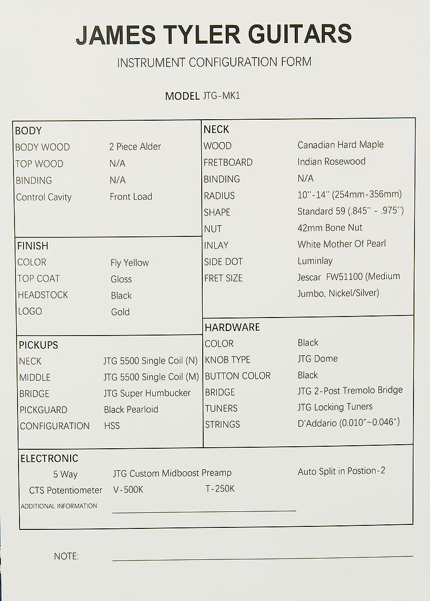 | Controls | 1 500K CTS Volume Pot, 1 250K CTS Tone Pot, 5-way Selector Switch, JTG Custom Midboost Control with Bypass Button |