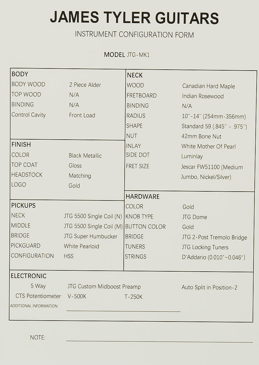 Controls1 500K CTS Volume Pot, 1 250K CTS Tone Pot, 5-way Selector Switch, JTG Custom Midboost Control with Bypass Button