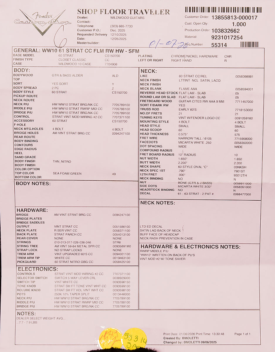 | Pickups | 3 Hand-Wound AlNiCo II Wildwood 10 Strat Single-Coils |