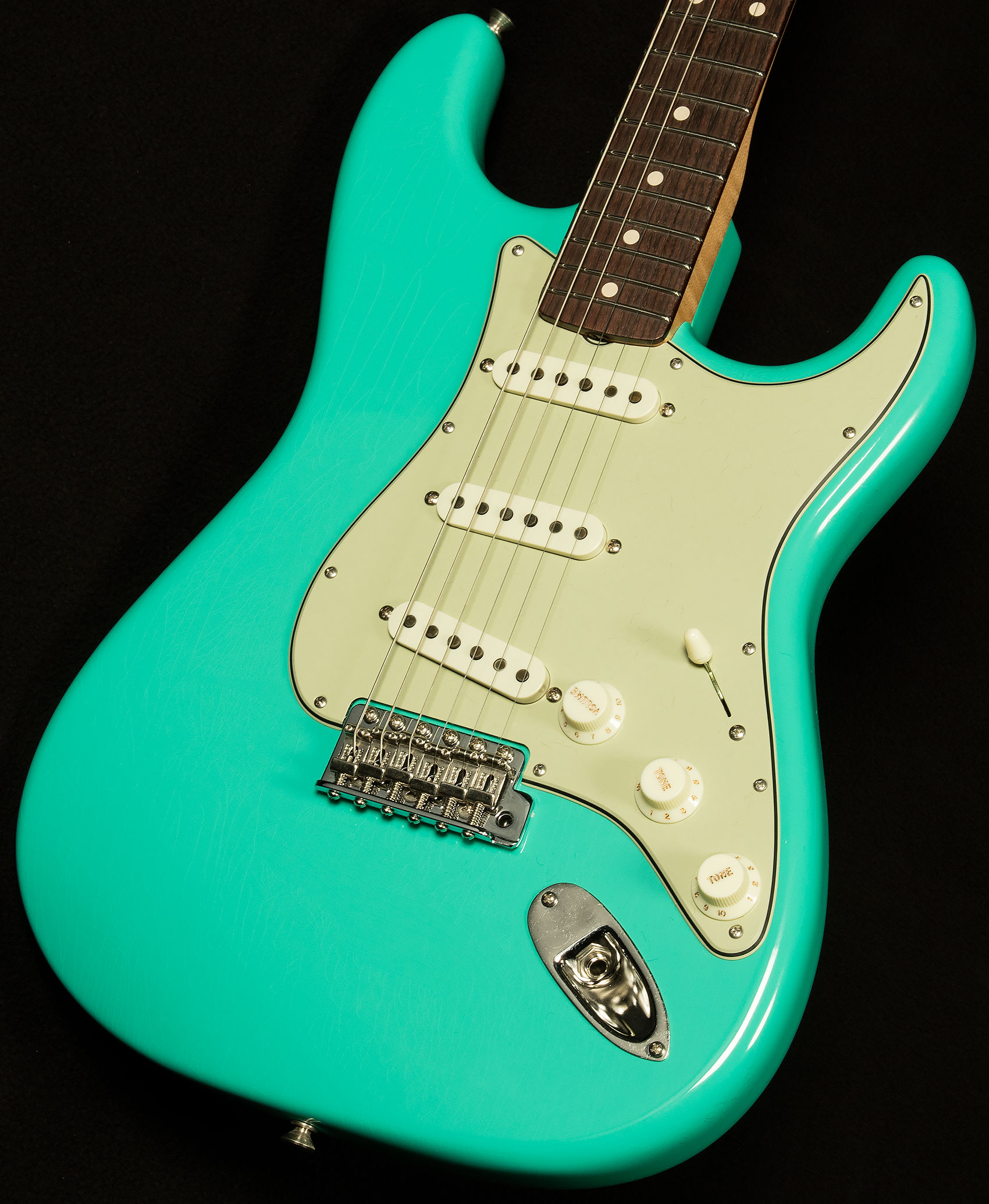 We believe that the Wildwood 10 Strat pickups our friends at Fender wind for us are some of the finest single-coils in the world. Here's a quick rundown of what makes them tick. They're slightly underwound, which gives them exceptional dynamic response and touch sensitivity. You can really alter your sound based on how hard you're hitting, which makes for a wonderfully expressive playing experience. However, they are wound with thicker wire like Fender did in the sixties, which gives them a little more power and guts despite being underwound. As a result, their voice is similar to vintage Strat pickups we love with lots of bell-like chime and vocal response, but with a little extra warmth and muscle.