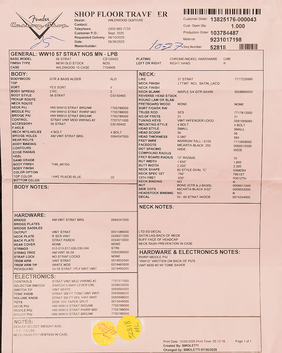| Pickups | 3 Hand-Wound AlNiCo II Wildwood 10 Strat Single-Coils |