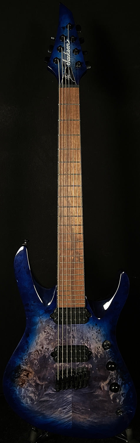 The Jackson Pro Series Signature Chris Broderick Soloist HT7P is a 25.5"-scale, 7- string guitar featuring a resonant mahogany body with an arched poplar burl top and through-body maple neck, scarf joint and graphite reinforcement for rock-solid stability and enhanced sustain. Its 12"-radius bound laurel fingerboard with 24 jumbo frets is ideal for all playing styles, comfortable for both low riffing and soaring leads.