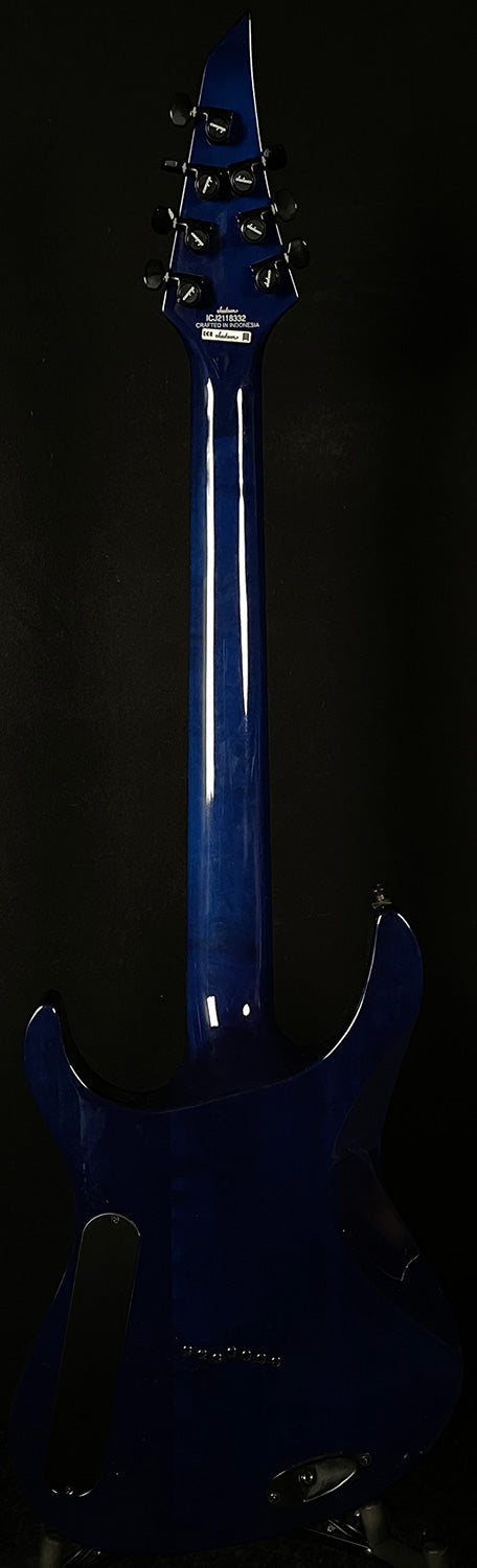A force to be reckoned with, the Pro Series Signature Chris Broderick Soloist HT7P is finished in Transparent Blue with matching reverse Jackson AT-1 3x4 headstock and black hardware.