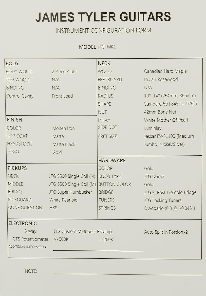 Wildwoodians, we love James Tyler guitars the way the lead singer of Australian duo Savage Garden loves the object of his affection: truly, madly, and deeply. That's why we're so excited about their freshest venture, JTG! JTGs are their new line of crafted-in-China guitars, and they capture the spirit of what makes a Tyler great at a very player-friendly price point. Though nothing compares to the peerless precision engineering and flawless tone of an American-made Tyler, the JTGs are scary guitars in their own right with their delectable tone, buttery playability, and eye-catching finishes that will make every guitar picker on your block green with jealous rage. This MK1 model in particular is a delightfully versatile HSS guitar!