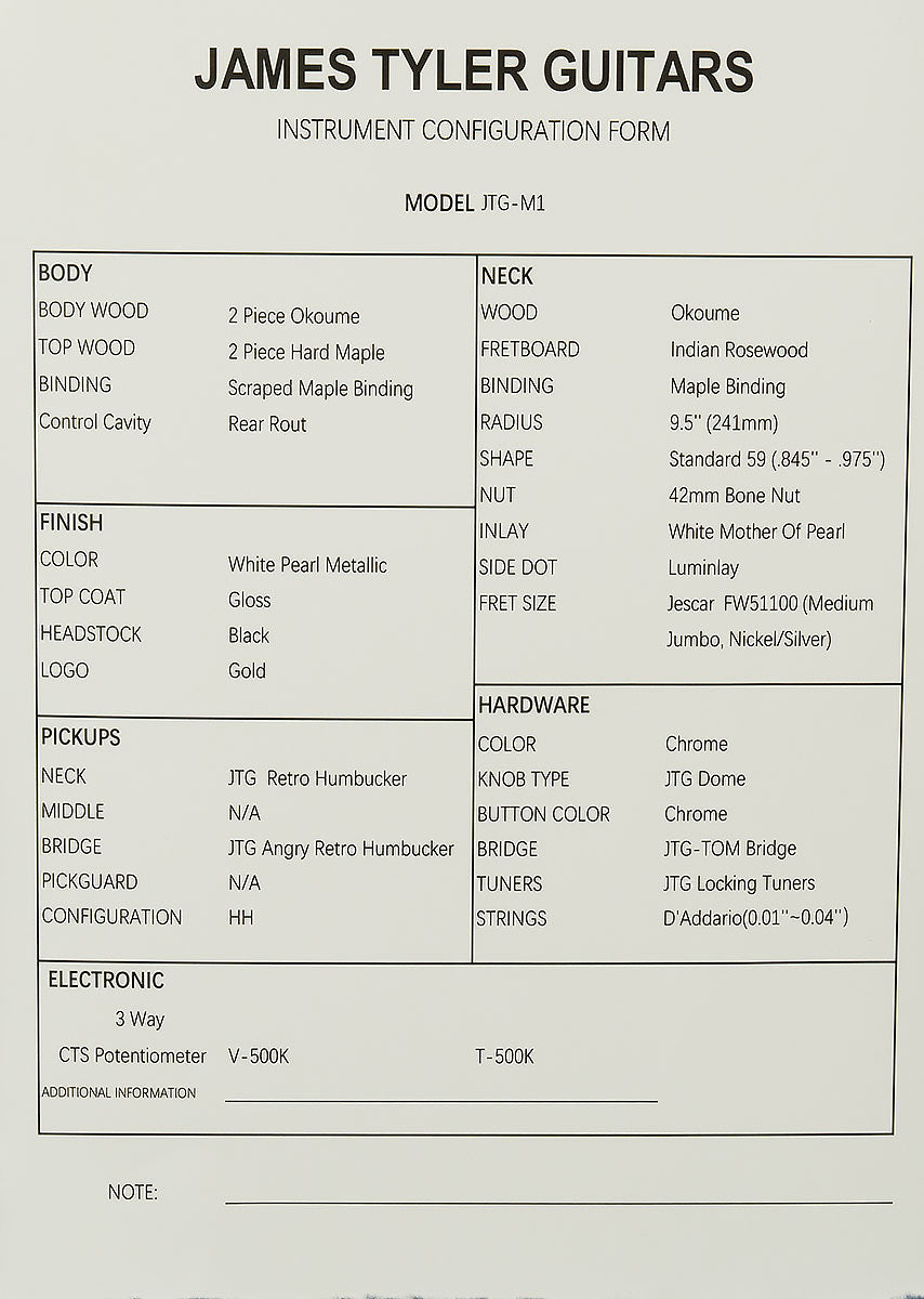 Wildwoodians, we love James Tyler guitars the way the lead singer of Australian duo Savage Garden loves the object of his affection: truly, madly, and deeply. That's why we're so excited about their freshest venture, JTG! JTGs are their new line of crafted-in-China guitars, and they capture the spirit of what makes a Tyler great at a very player-friendly price point. Though nothing compares to the peerless precision engineering and flawless tone of an American-made Tyler, the JTGs are scary guitars in their own right with their delectable tone, buttery playability, and eye-catching finishes that will make every guitar picker on your block green with jealous rage. This M1 in particular is a dual-humbucker vehicle for musical madness! A Tale of Two Humbuckers
