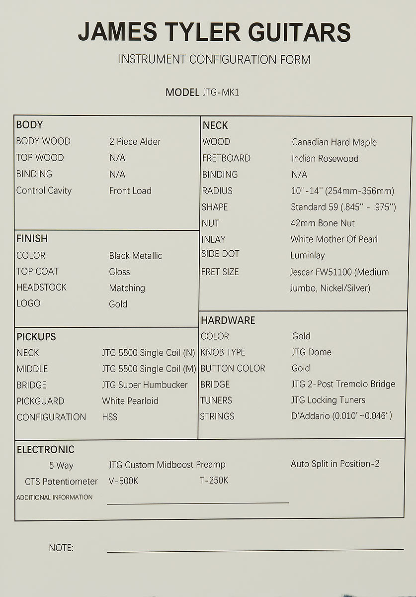 Wildwoodians, we love James Tyler guitars the way the lead singer of Australian duo Savage Garden loves the object of his affection: truly, madly, and deeply. That's why we're so excited about their freshest venture, JTG! JTGs are their new line of crafted-in-China guitars, and they capture the spirit of what makes a Tyler great at a very player-friendly price point. Though nothing compares to the peerless precision engineering and flawless tone of an American-made Tyler, the JTGs are scary guitars in their own right with their delectable tone, buttery playability, and eye-catching finishes that will make every guitar picker on your block green with jealous rage. This MK1 model in particular is a delightfully versatile HSS guitar! Sizzling Sonic Power First things first: these guitars sound M O N S T R O U S! The pickups are right in the sweet spot: hot enough to where consistent, even response is easy to achieve, but underwound enough that they still have expressive dynamic range. In general, all three pickups have an open, sunny tone with superb clarity and an even tone with more high-end AND low-end than normal. So, the highs are brilliant, the mids are punchy, and the low-end has more beef than all the Arby's in Omaha. The bridge humbucker is a perfect muscular rock tone, and the single-coils have just the right amount of bite, sparkle, and sizzle without any attendant harshness. Then, when you switch on the midboost, you get this beautifully fat, warm, smooth tone. Basically, in normal mode, it sounds like a 'roided out David Gilmour tone, and in midboost mode, it sounds like the Incredible Hulk version of SRV. Fantastic Fit and Finish