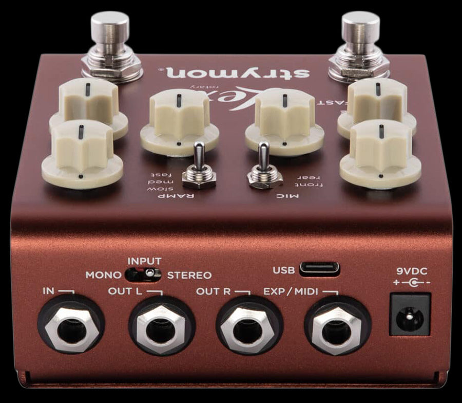 The second generation Lex gives you the same rich rotary sounds of our original and adds significant new features, incorporating technological advancements, hardware improvements and design enhancements to give you additional flexibility, power, and ease of use on stage and in the studio. Full MIDI implementation means you can control just about every switch, knob, and setting remotely by sending MIDI commands from your controller or DAW via Lex's EXP/MIDI jack or USB-C connection. Rotor speed can be synchronized via MIDI Clock Sync, and the sync setting can be saved for each preset. 300 MIDI preset locations are available for loading and saving your favorite settings. A premium analog JFET input circuit ensures superb responsiveness to your playing, and you can select mono or stereo input with the flick of a rear panel switch. All this, plus a new ARM DSP chip provides more processing power for every sonic nuance, with less energy consumption on your pedalboard. A more powerful and intuitive user interface gives you instant control over mic position and distance, dry level, acceleration speed, volume boost/cut, and easy customization of rotor speed. Everything you need for the full rotary speaker experience is at your fingertips. High impedance ultra low-noise discrete Class A JFET TRS stereo input. Low impedance independent TS stereo outputs. Expression pedal input allows the connection of a TRS expression pedal, MiniSwitch, MultiSwitch Plus, or TRS MIDI connection. USB jack for controlling via MIDI from a computer or for performing firmware updates. Dedicated Slow/Fast rotary speed & On/Off footswitches