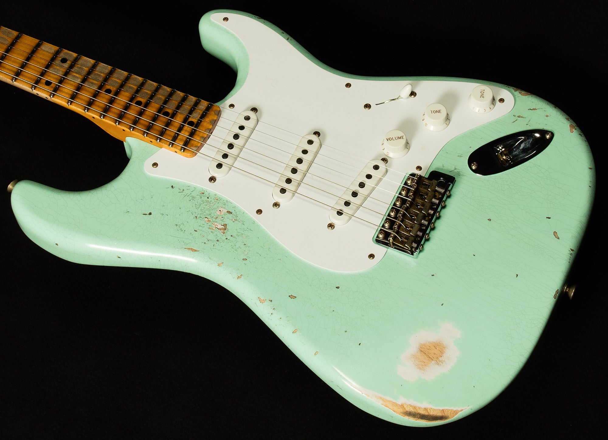 We believe that the Wildwood 10 Strat pickups our friends at Fender wind for us are some of the finest single-coils in the world. Here's a quick rundown of what makes them tick. They're slightly underwound, which gives them exceptional dynamic response and touch sensitivity. You can really alter your sound based on how hard you're hitting, which makes for a wonderfully expressive playing experience. However, they are wound with thicker wire like Fender did in the sixties, which gives them a little more power and guts despite being underwound. As a result, their voice is similar to vintage Strat pickups we love with lots of bell-like chime and vocal response, but with a little extra warmth and muscle.