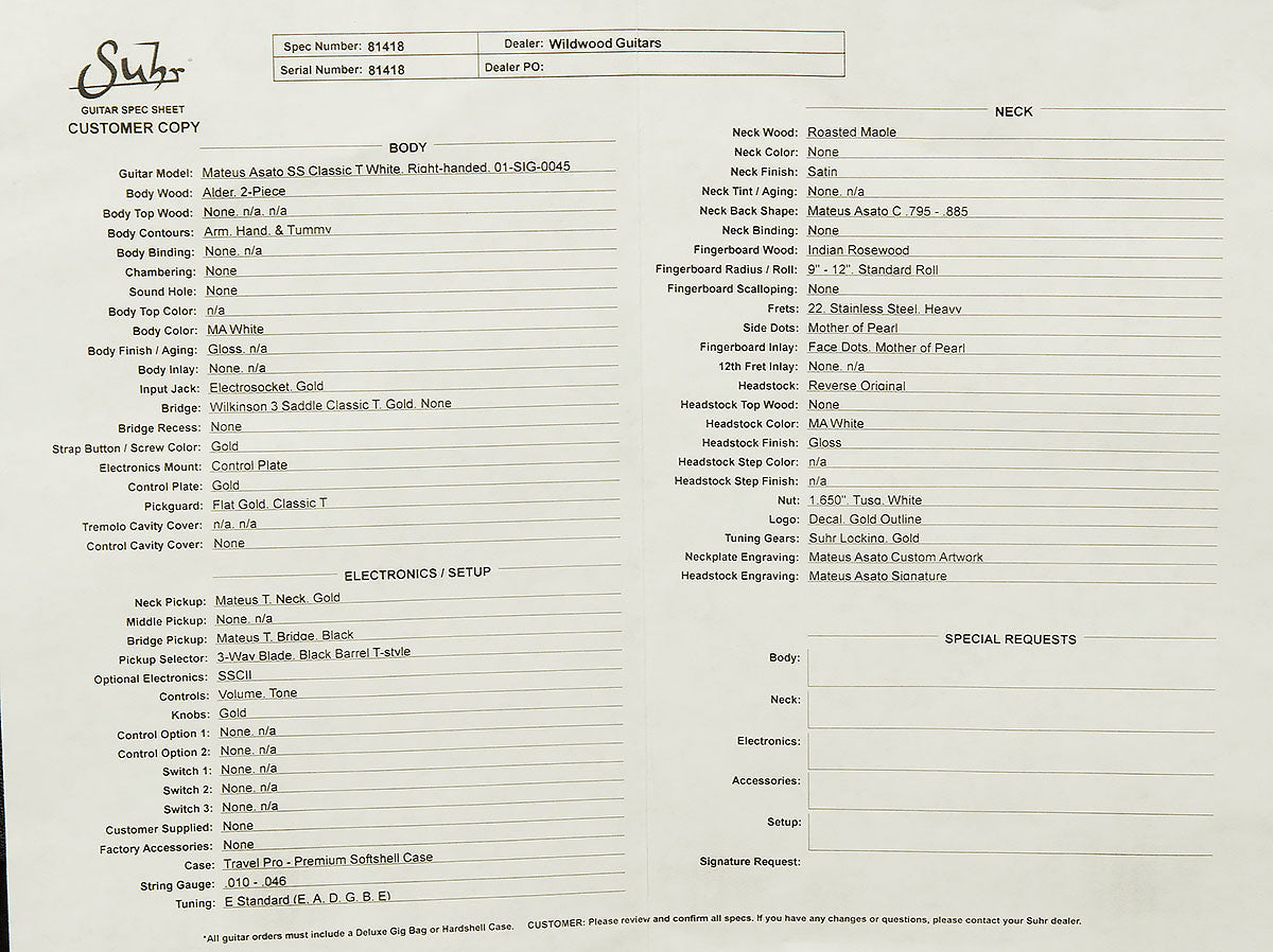 Mateus Asato is a guitar wunderkind. He was born in Brazil in 1993, where he started playing guitar at age nine and progressed with stunning speed. After only a couple years of private lessons and a few years on his local church's worship team, he vaulted into the national spotlight by beating out over 500 guitarists in a national guitar competition called "Double Vision." The kicker? He was only sixteen at the time! A few years later, he moved to LA and attended the prestigious Musician's Institute, where he was named their Outstanding Guitar Player in 2014. Since graduating from school, Mateus has worked with a laundry list of superstars, including Adoração & Adoradores, Duranbah, Esteban, Israel Houghton, Jabin Chavez, Luan Santana, Mammoth, Storge2, and Tiago Suguihara. He's best known in America for playing guitar with Tori Kelly and for posting sensational viral guitar videos. Naturally, Mateus's incredible virtuosity attracted the attention of Suhr Guitars, and they put their heads together to create a truly boss signature model guitar. Obviously, the striking combination of black paint, black pickguard, and gold hardware makes it drool-worthy, but it's not the skin-deep kind of beauty. Two Mateus Asato Classic T pickups allow it to sing out with a truly powerful voice, too! Add in Suhr's exceptional build quality and a ridiculously comfortable medium C-shaped neck profile with a 9"-12" radius, and you get one heck of a signature model! Flawless playability and inspiring sounds--what more could you ask for? We know that this stellar signature model will inspire you to no end, and we can't wait to see what musical adventures it takes you on.