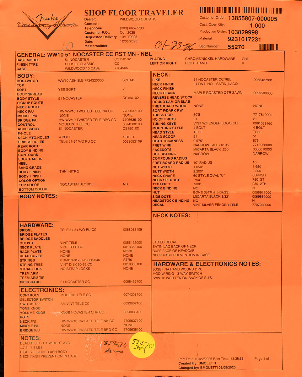 Because of their incredible rarity, original Nocasters have become some of the most desirable vintage pieces out there. So, we decided to team up with our friends at the Fender Custom Shop and issue a Wildwood 10 version that marries the vibe of the originals with modern ergonomics. The Wildwood-exclusive 10" radius and 6105 frets are a perfect pairing with the '60 Oval C profile, and the Custom Shop hand-wound Twisted Tele pickups deliver spectacular sounds. We're sure you'll find a Nocaster here that will grab you by your heartstrings, so we invite you to browse away-just make sure your keyboard drool shield is in place!