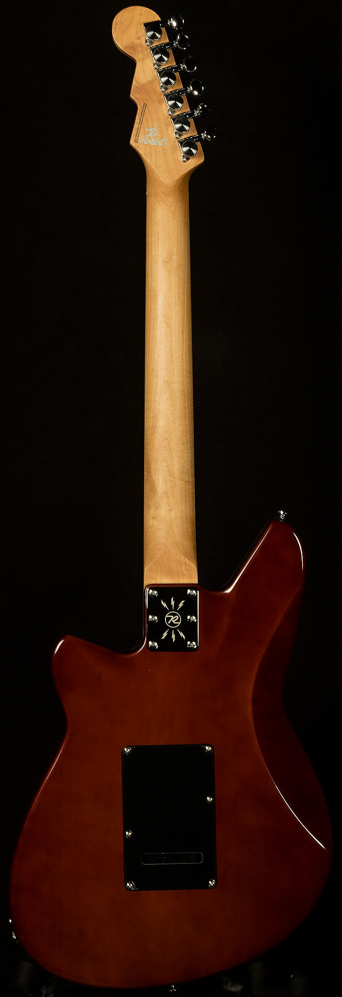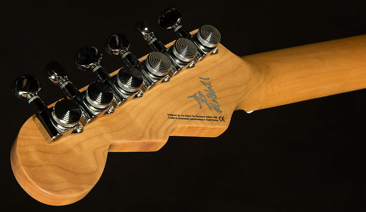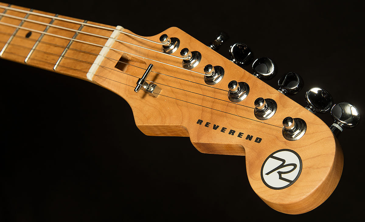 Before starting Reverend Guitars, Joe Naylor (the brains behind Reverend designs) worked as a guitar repairman. Over the years, he kept a mental checklist of all the most common guitar ailments and afflictions. Once he started building, he sought to improve his designs to head these issues off at the pass with thoughtful designs meant to improve durability, stability, and playability. For instance, input jacks always go squirrelly, so each Reverend has a four-bolt jack plate instead of a two-bolt, because more bolts means it's less likely to move. The same principle applies to many aspects of this guitar's design. It has a six-bolt neck plate instead of the usual four, so the neck is much less likely to move. It's also at a slight angle, which makes it easier to access the upper frets. Speaking of which, the neck is made of roasted maple, which has a lower moisture content, so it's less likely to move with humidity (and it acts as a wooden tuning fork of sorts, boosting the guitar's sustain and resonance a little bit). For those who love to whammy it up, it has a Wilkinson WVS50 IIK Tremolo, which is as bulletproof and stable as they come. Speaking of tuning stability, the Boneite nut and pin-lock tuners make tuning (and staying in tune) a breeze. To top it off, it has boutique-quality pots and caps, which ensure each guitar has reliable, consistent electronic components. Basically, all of that makes each Reverend supremely reliable, capable of withstanding abuse night in and night out. Reverend's playability matches the sky-high standards it sets in durability and stability. Their necks are a marvel: an uber-comfy medium oval C with a 12" radius and 0.110" wide x 0.050" high frets create a comfortable home for just about any play-style. The flat radius allows for a lower setup and lets you bend strings with low action without the notes choking out and dying. The larger frets also reduce left-hand exertion and make it easier to play precisely, and the overall profile sits squarely in the Goldilocks Zone: not too thick and not too thin. It's a configuration that works well for just about any play style, and it is universally beloved by the Wildwood staff. That's all a long-winded way of saying that this Reverend will be a dependable and helpful companion throughout all your fretboard adventures, making it easier for you to express yourself creatively at every turn.