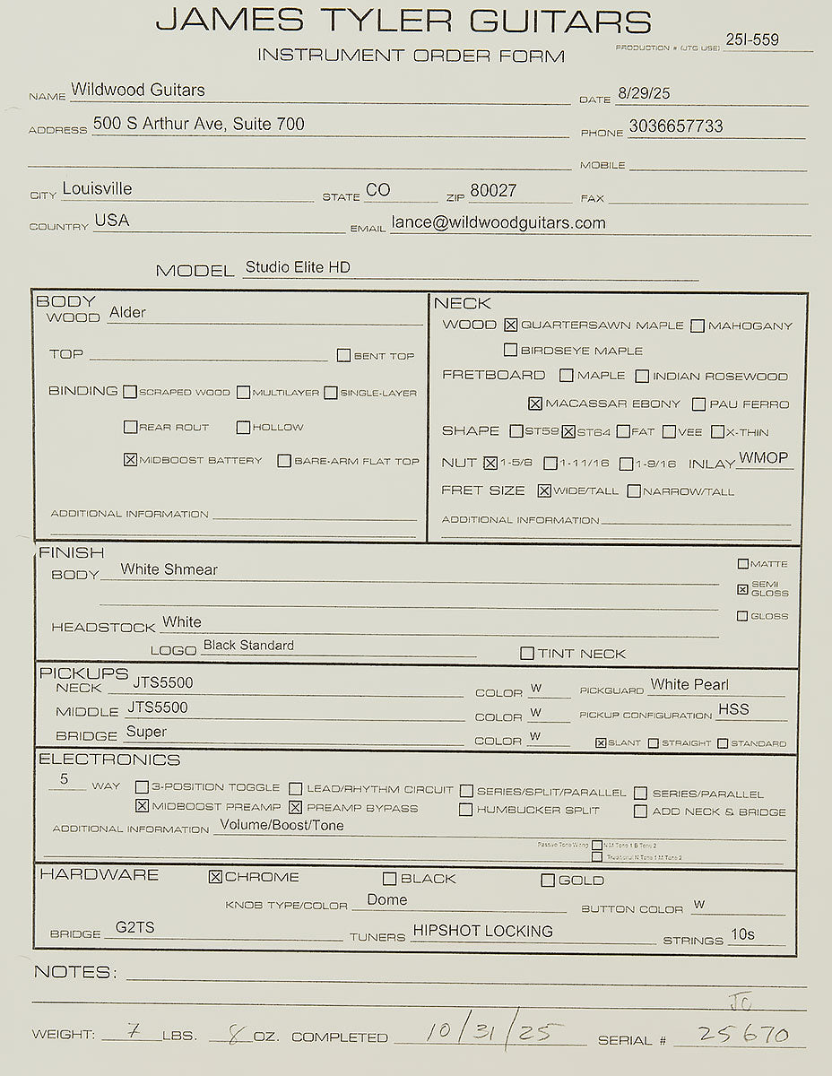 Imagine an exclusive club filled with guitar legends. Some are players like Michael Landau, Steve Lukather, David Williams, Abe Laboriel, Dann Huff, and Buzz Feiten-guys who are your favorite player's favorite players, the session guys whose riffs and licks are more famous than their names. Some of them are so famous that they go by one name, like Prince. John Fogerty, Steve Howe, Elvis Costello, Walter Becker, and George Lynch are there, too. But, it's not an elitist affair, even though the players are of an elite caliber. You don't need a special knock or a password or knowledge of an alleyway entrance to get into this secret gathering-just a James Tyler guitar, because it's the James Tyler Owner's Club. Though the clubhouse (sadly) isn't real, James Tyler's guitars do carry an air of mystique and secrecy about them-not because they're elitist, but because James Tyler simply doesn't do much promotion. He lets the guitars do the talking for him. Nevertheless, when you see someone with a James Tyler guitar slung over their shoulder, you know that they belong to the select echelon of guitar players who are in the know. If you don't know, now you know, Wildwoodians. Let's take a trip down the secret passageway and see why the James Tyler Secret Society is such a special group to belong to. James Tyler is a bit of a mysterious figure. He rarely gives interviews, and he doesn't care to advertise, relying on word-of-mouth to grow his business. Here's what we do know: after spending his teenage years taking apart his guitars "for no good reason," he worked his way through college by doing repair work on guitars and cars. One has to imagine that this unique combination of experiences gave him an appreciation for old-world manufacturing techniques and modern precision engineering. After spending a couple years as the main repair and restoration specialist at Norman's Rare Guitars, he graduated to building guitars. At first, he assembled guitars out of parts from Schecter, Kubicki, and custom-made Tom Anderson parts. This was right as the Super Strat craze was taking off, and everyone in LA was looking for hot-rodded guitars with lightning-fast handfeel. James was the right man for the job. True to form, James moved his shop to a building in North Hollywood with no signs of any kind that would even provide a hint that it was James Tyler's HQ. But, greatness can't escape notice for long, and soon there was a steady stream of renowned L.A. musicians trickling into his shop. Word spread like wildfire that James was building instruments that played beautifully and sounded absurdly good, and pretty soon he built a large clientele. Thus began the era when the sound of James Tyler guitars dominated the airwaves. case in point: the most ubiquitous song of the eighties, Michael Jackson's Billie Jean, featured David Williams playing the song's iconic riff on his Tyler. Tylers formed the sonic backbone of countless hits in the eighties, cementing James Tyler's place in the pantheon of guitar Valhalla. Tylers surged in popularity from then on, but James was never content to rest on his laurels. He pushed forward with innovative new finish techniques, and he came up with some of the coolest colors in the world with names like Psychedelic Vomit, Alien Guano, Barn Find, Malibu Beach Shmear, Burning Water, and our Wildwood-Exclusive finish, Ice Water. He also developed his own proprietary pickups, which sound absolutely otherworldly. So, what is the secret behind the quality of James Tyler's guitars? How did they impress so many studio musicians? The secret is James's commitment to combining precise modern manufacturing techniques with old-world craftsmanship. Sure, they may use computerized milling machines, laser machines, 3D modeling stations, and engineering techniques from the aerospace industry in order to make sure that each guitar plays easily, but they make sure to leave plenty of room for the human element. Each neck is still given its final shape by hand, and the Tyler team spends hours sanding and painting the bodies and dressing the frets. After that, each guitar goes through rigorous...actually, "insane" is probably a better word for the level of testing they put each guitar through after assembly. They set it up, plug it in, and test it thoroughly to make sure it will meet the standards of the most demanding player, then they set it up again before they ship it out. The folks at James Tyler often say that they want each guitar they build to feel like an old friend when you play it for the first time. Their commitment to balancing sweat equity with Sci-Fi engineering allows them to hit the mark every time. We are proud to showcase our selection of James Tyler guitars. They are precisely-built instruments with a heaping helping of heart and soul, and we know their resonance and playability will inspire you to make all kinds of joyous loud noises.