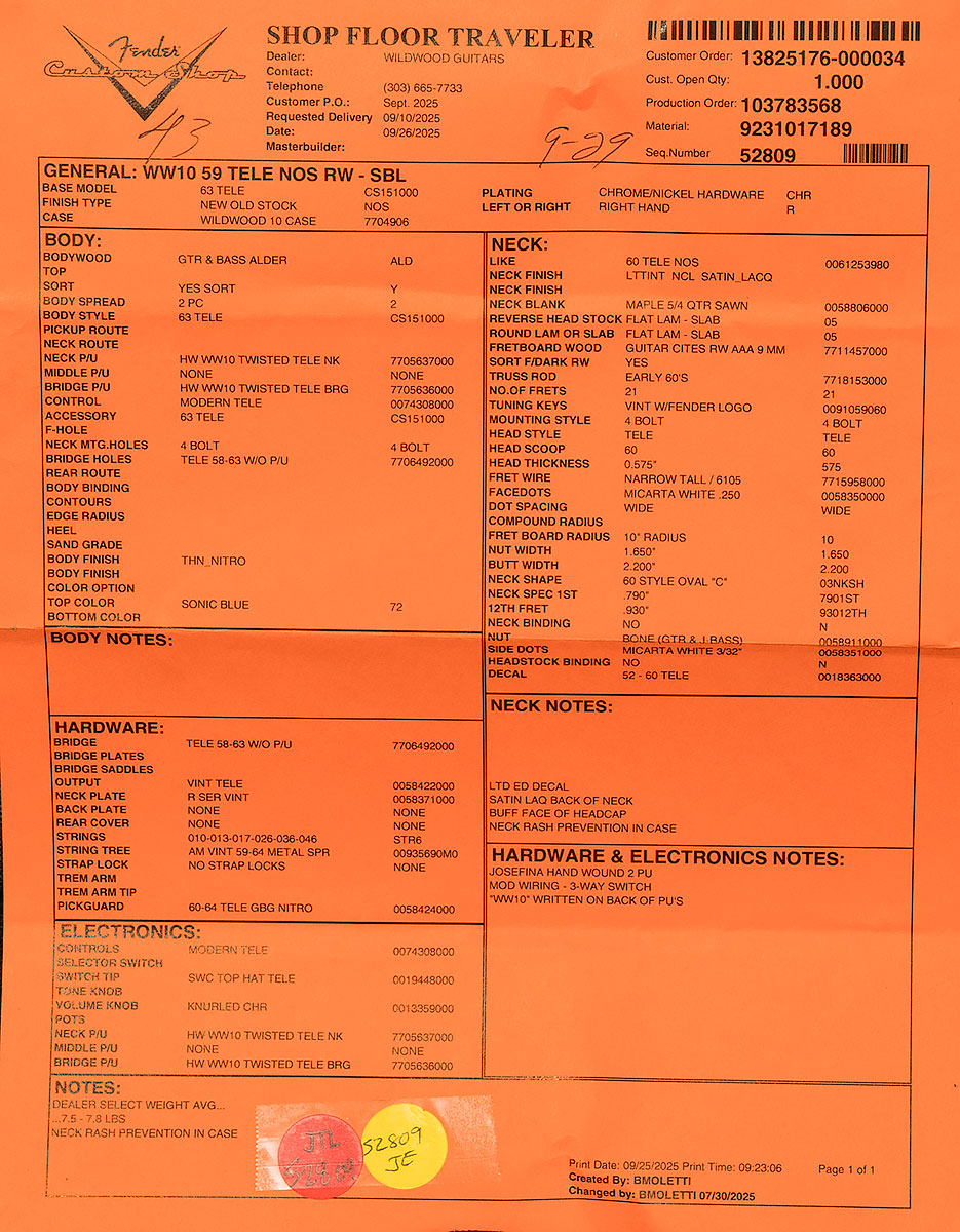 Wildwoodians, the Hand-Wound Wildwood 10 Twisted Tele pickups in this guitar are the winners of the most fearsome shootout since the OK Corral! When we were trying to figure out what type of special sauce to put in our Wildwood 10 Tele pickups, the Twisted Tele was an easy choice for a starting point. Standard Twisted Teles have high output for fiery Tele tone, a dash of Strat-y sparkle, and excellent articulation. That sounded like a good base to work from, so we asked our friends at the Custom Shop to send us some underwound versions with AlNiCo II magnets instead of the standard AlNiCo V, and we asked that Fender's resident pickup maestro, Josefina Campos, be the one to wind them. They sent us multiple guitars with different output levels, and the whole staff got together to put them through their paces and compare notes. After a delightful Tele-filled afternoon, we reached a rare unanimous consensus, and these pickups emerged bloodstained from the octagon as the winner.