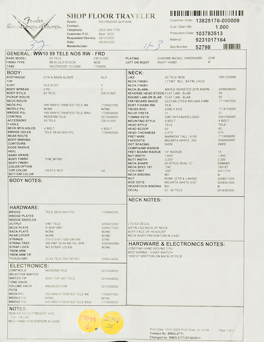 Wildwoodians, the Hand-Wound Wildwood 10 Twisted Tele pickups in this guitar are the winners of the most fearsome shootout since the OK Corral! When we were trying to figure out what type of special sauce to put in our Wildwood 10 Tele pickups, the Twisted Tele was an easy choice for a starting point. Standard Twisted Teles have high output for fiery Tele tone, a dash of Strat-y sparkle, and excellent articulation. That sounded like a good base to work from, so we asked our friends at the Custom Shop to send us some underwound versions with AlNiCo II magnets instead of the standard AlNiCo V, and we asked that Fender's resident pickup maestro, Josefina Campos, be the one to wind them. They sent us multiple guitars with different output levels, and the whole staff got together to put them through their paces and compare notes. After a delightful Tele-filled afternoon, we reached a rare unanimous consensus, and these pickups emerged bloodstained from the octagon as the winner. How Do They Sound?