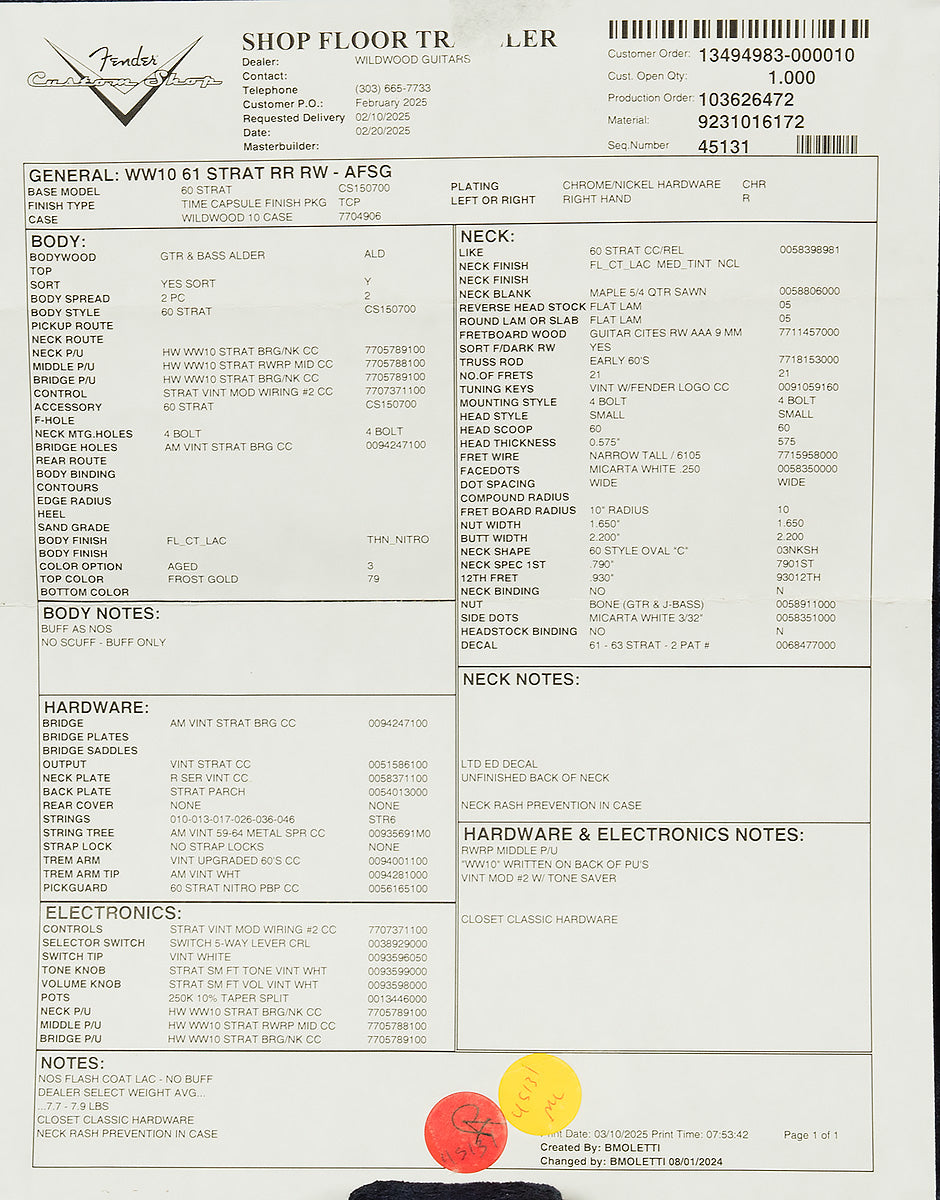Each of these Custom Shop creations features a thin fifties-style nitrocellulose finish, which allows the voice of the resonant hand-selected tonewoods to shine through. They also have hand-wound Custom Shop pickups that are sure to inspire you to reach new heights on your sonic journey. Wildwood 10s feel great in your hands, too. Their modern 10" radius is suitable for a wide variety of styles and techniques, and their 6105 narrow-tall frets allow you to expend less energy with your left hand, especially when bending strings. To top it all off, they come with a limited edition Dealer Select Wildwood 10 hardshell case and a certificate of authenticity.